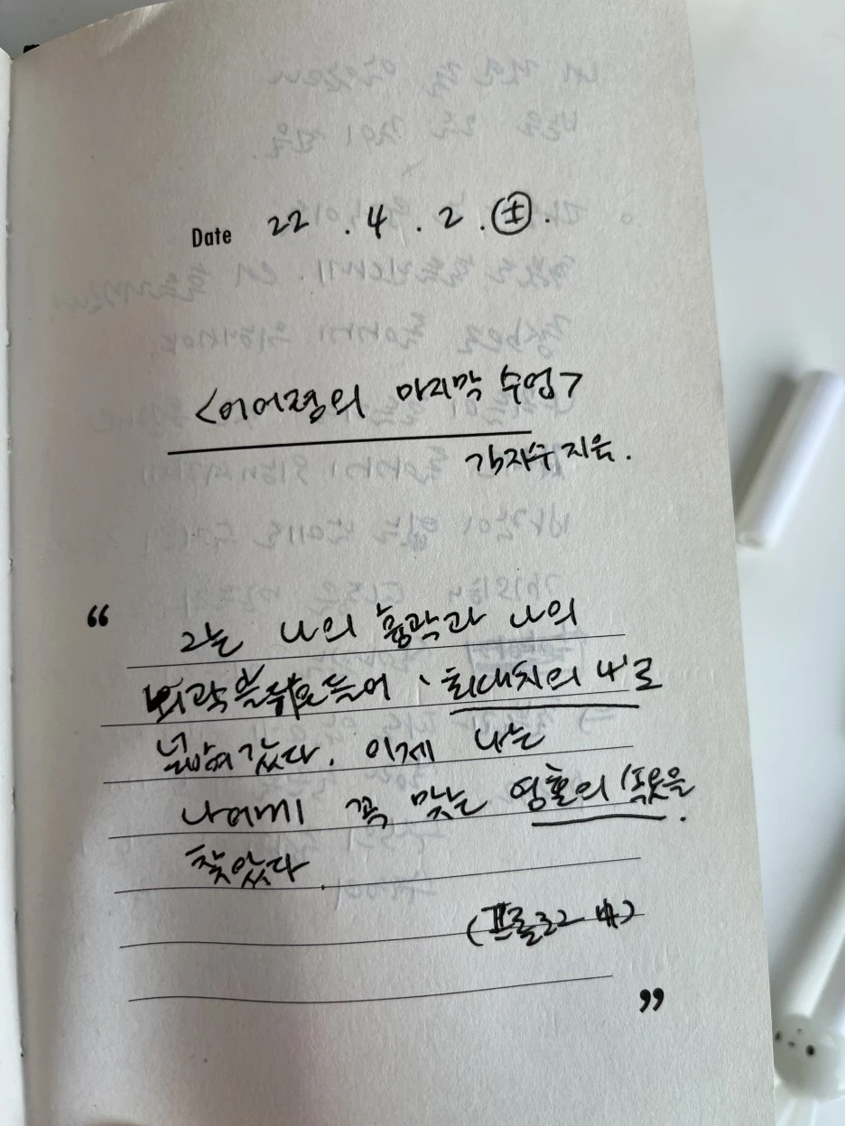 4월 2일 필사한 책은 [#출근전읽기쓰기] 북클럽 3기에서 읽는 이어령 선생님이 인터뷰이로 나오시는 <이어령의 마지막 수업>으로. 다시 책을 펼치는 내내 기억해야 하고 메모해야 할 부분이 많았다. 다행히 1시간가량 나만의 시간을 확보하여 좋아하는 카페 숍에서 찬찬히 책을 훑어보고 필사했다.