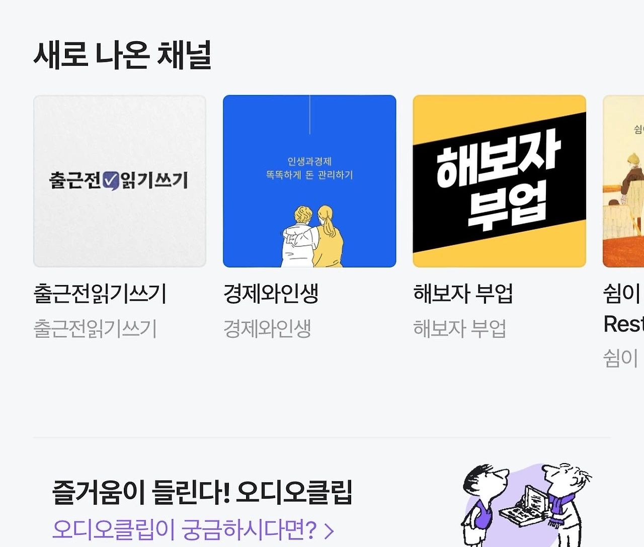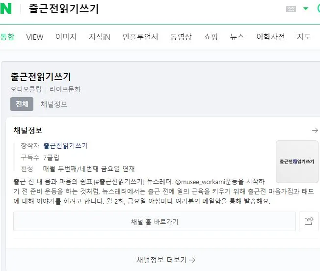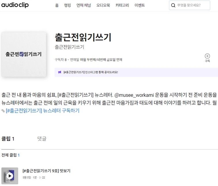 이제 네이버 포털에서 ‘출근전읽기쓰기’ 를 검색하면 바로 찾을 수 있어요. 네이버 #오디오클립 에 등록되었기 때문인데요.지난 뉴스레터 통해 인사드리며, 오디오콘텐츠도 준비하겠다고 말씀드렸는데오. 한달 만에 승인!!되었습니다. 9호 뉴스레터를 들을 수 있는 맛보기 오디오도 있어요.