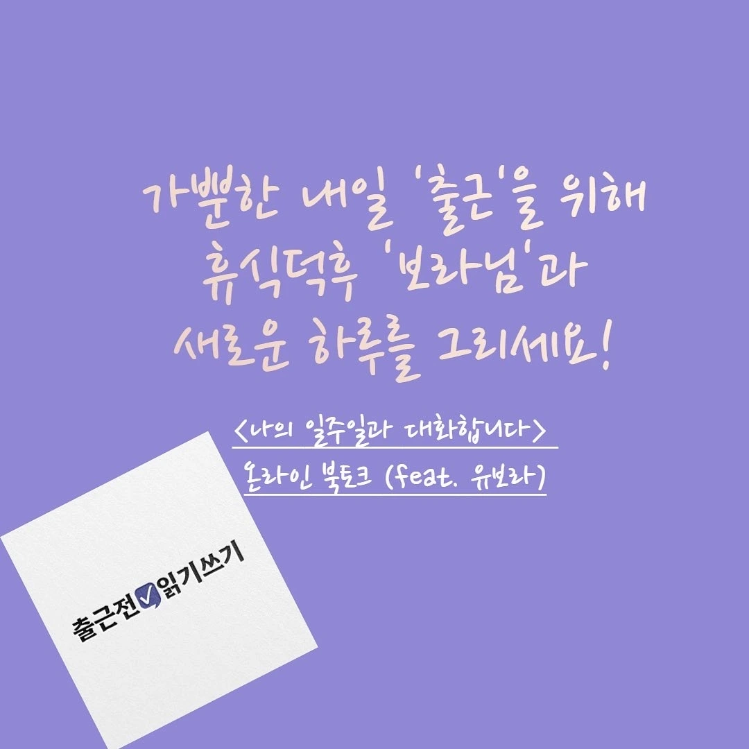 쉬었다고 생각했지만 늘 지치는 출근길, 휴식 덕후 '보라님’께 쉼에 대해 마음껏 물어보세요! '나를 돌보는 루틴과 휴식만을 연구’하는 휴식 덕후 보라님은 <나의 일주일과 대화합니다> 책 저자로서 라이프 컬러링을 연구하고 계셔요. 직접 발행하는 휴식 관련 뉴스레터 ‘제철 휴식’도 구독해보세요.