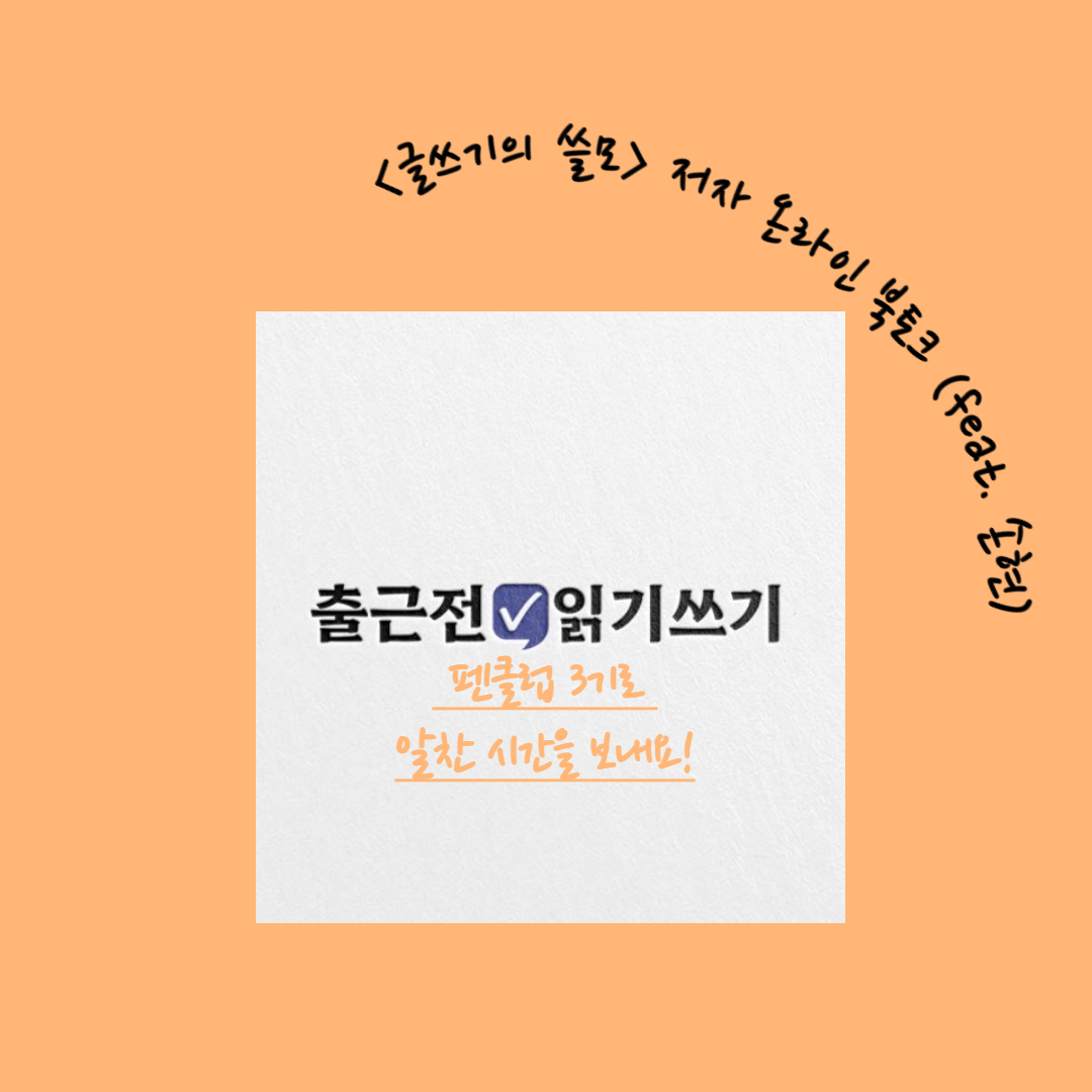 * <글쓰기의 쓸모>책 1권 증정 + 저자 온라인 북토크 + 클럽원과 마지막 줌미팅 + 글쓰기 10회 인증시 1만원 상당의 선물 증정) **책 소지시 저자 다른 책 1권 또는 저자 추천책 1권 증정