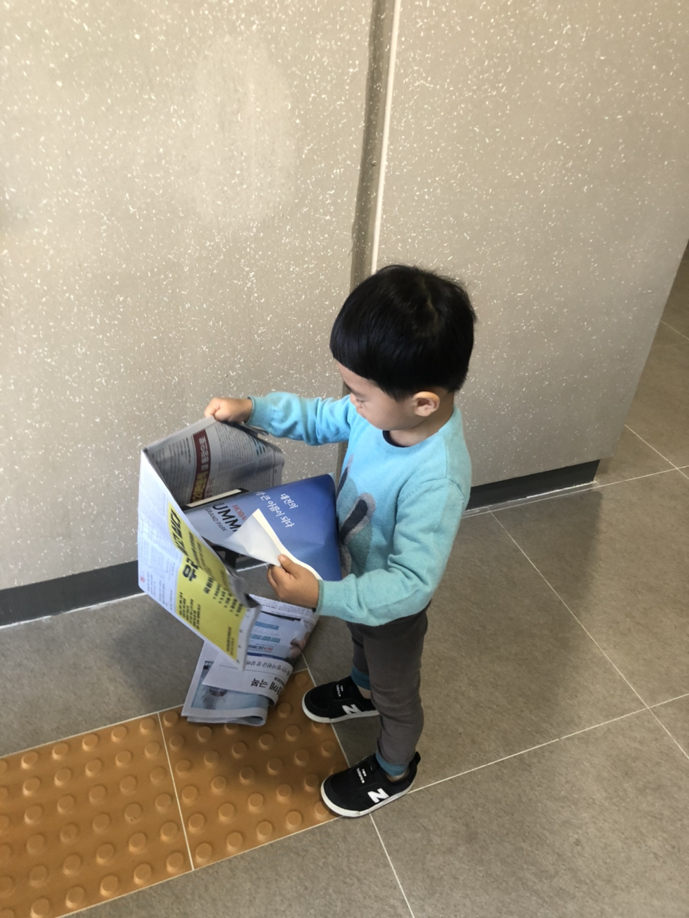등원•출근길에 자신의 낮잠이불가방이나 내 에코백을 먼저 챙겨 들어줄 때가 있다. 현관 앞에 놓인 아침신문을 꼭 챙겨주는 기특한 아이