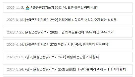 "요즘 재택이나 프리랜서로 일하는 분들이 많아지면서 향후 잊힐 수 있는 우리의 출근길을 담고 싶어 졌어요. 이 뉴스레터가 ‘출근길의 아카이빙’ 도구가 될 수 있다고 생각해요. 회사 안에서 받는 스트레스가 곧 일이 될 수 있지만.. 동료(상사, 부하 등)에게 받는 스트레스로 출근이 두려워지는 사회 뉴스가 많아졌더라고요. 20대의 저도 그랬고요. 직장 내 괴롭힘이 대두되면서 제 레터에는 꼭 회사 말고, 내가 몸담은 조직 외에서도 좋은 동료를 찾고 같이 일할 수 있는 좋은 사람들을 만나는 커뮤니티를 만들고 싶어 지더라고요. 동료라는 단어를 긍정적으로 사용하고 싶게끔, 꼭 속한 조직 내 동료보다 조직 밖에서 좋은 동료를 만날 수 있다는 마음. 제 레터에 기고하는 ‘일벗’, 동료의 순우리말인 '한 곳에서 함께 일하는 벗'을 만나고 싶어요. 이 레터로 서로 간의 일벗들을 만날 기회도 많아지길 바랍니다." (출근전읽기쓰기 0호, 21년 12월 16일 발행)