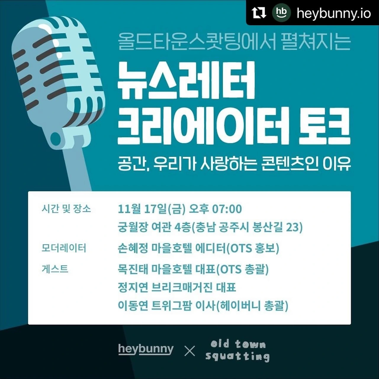 올드타운스쾃팅 행사의 부대 프로그램이자 헤이버니의 첫 오프라인 행사 ‘뉴스레터 크리에이터 토크'는 11월 17일 함박눈이 내리던 날, 궁월장 여관에서 ‘공간, 우리가 사랑하는 콘텐츠인 이유’라는 주제로 열렸습니다.