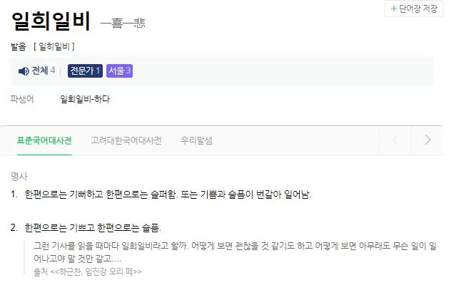 어느 날 이 단어를 저희집 여섯 살짜리 꼬마가 쓰고 있더라고요. 평소 어른들이 쓰는 단어에 관심이 많은 꼬마라 생경한 단어들을 쓸 때마다 코웃음을 치곤 했는데요. '일희일비'의 뜻을 알고 쓰는 건지 의아스럽긴 했습니다.