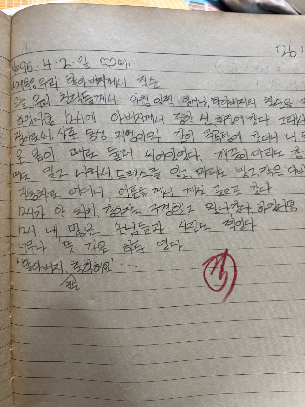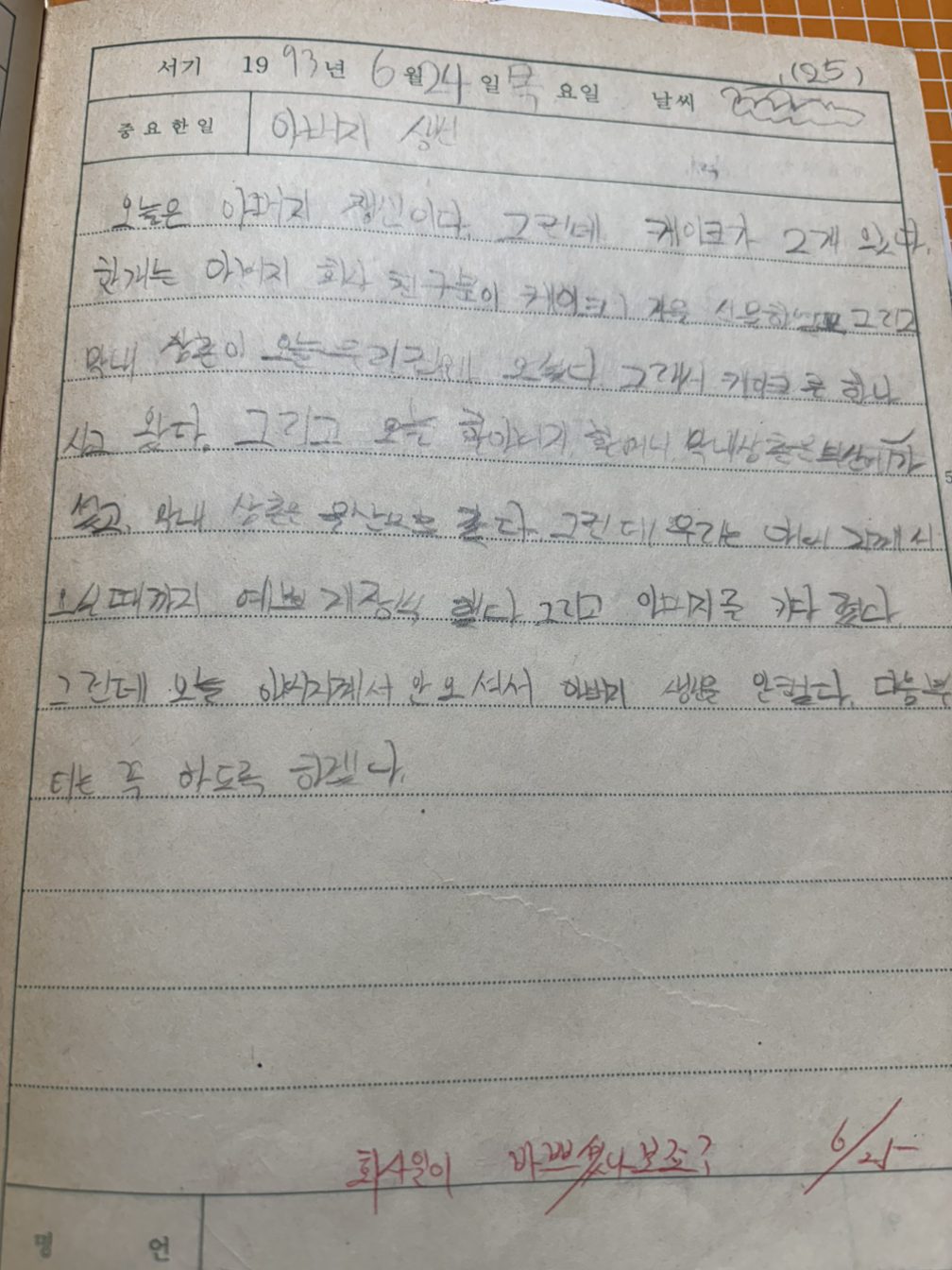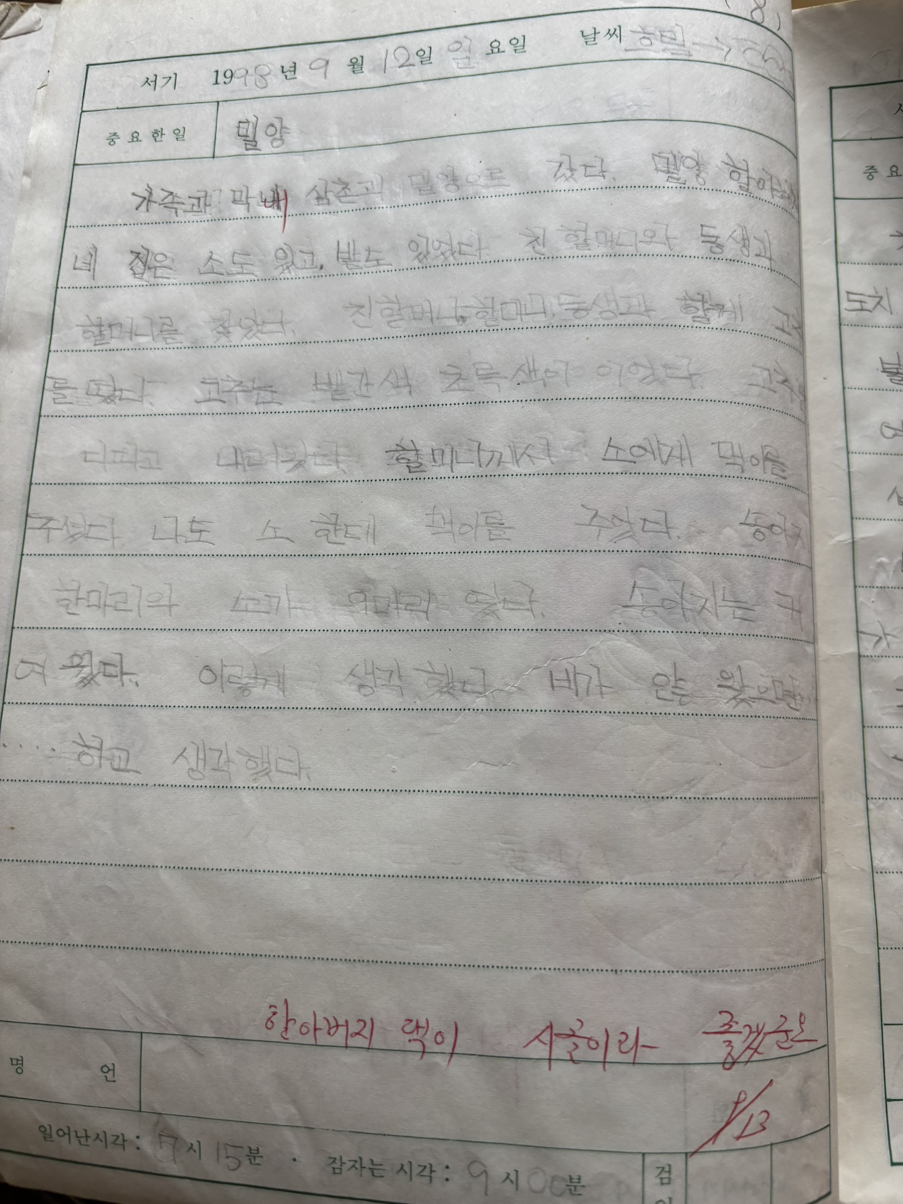 그 역사는 초등학교 1학년 때부터 썼던 내 일기장에 고스란히 기록되었다. 발인을 마치고 친정집으로 돌아와서 초등학교 1학년 때부터 6학년 때까지 일기장을 훑어봤다. 초등학교 입학을 앞둔 아이와 요즘 매일 일기 쓰는 습관을 만들고 있는지라, 자연스레 찾게 된 나의 과거사에서 제사, 부산, 어버이날, 성묘, 밀양 등 조부모님과 관계된 단어들을 발견할 수 있었다.