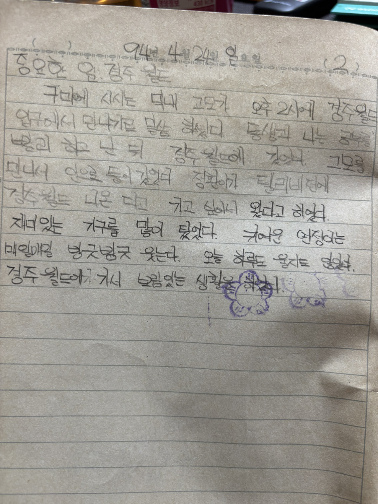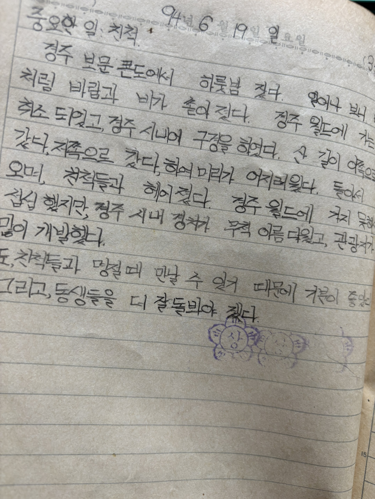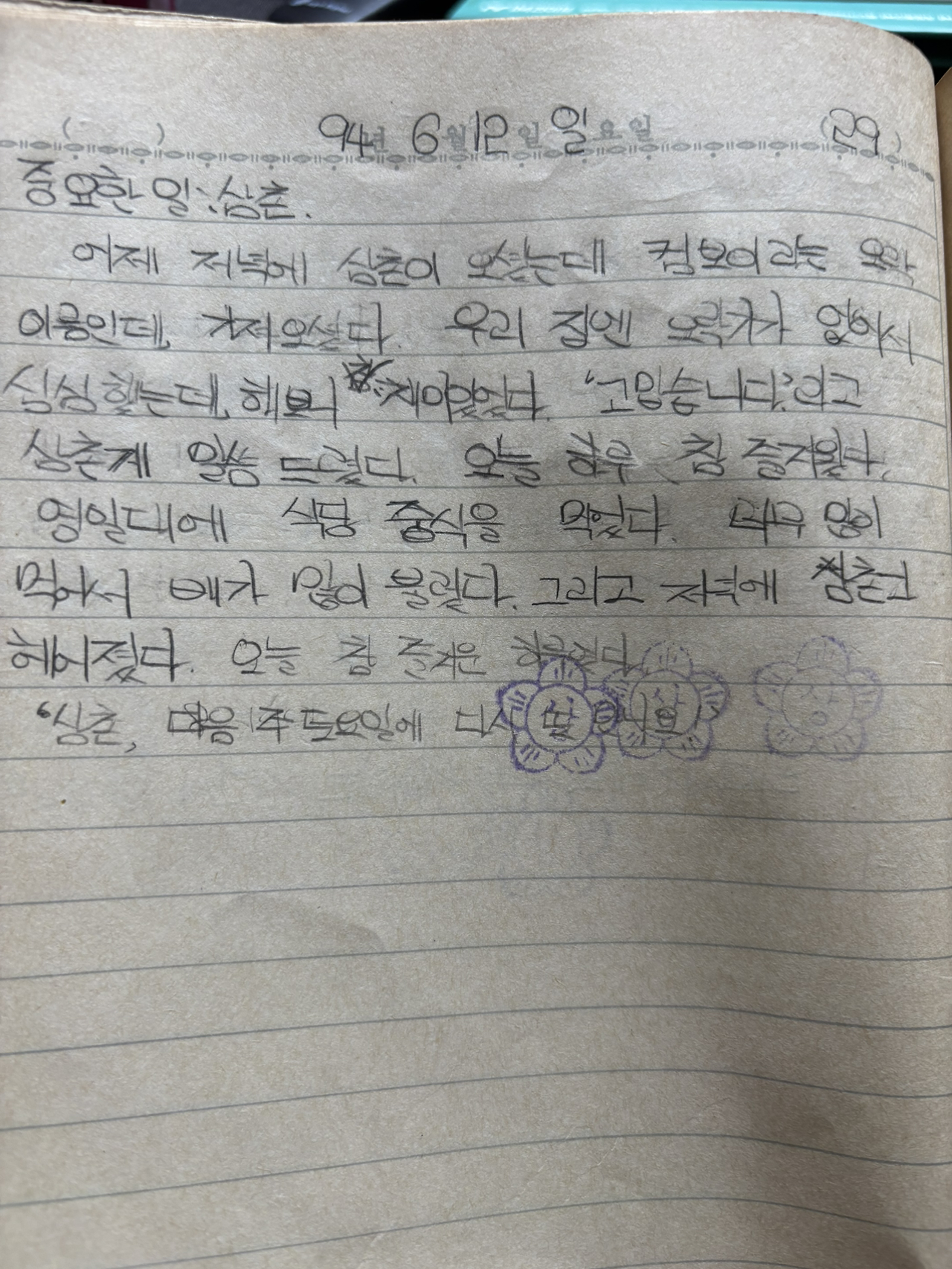 그 역사는 초등학교 1학년 때부터 썼던 내 일기장에 고스란히 기록되었다. 발인을 마치고 친정집으로 돌아와서 초등학교 1학년 때부터 6학년 때까지 일기장을 훑어봤다. 초등학교 입학을 앞둔 아이와 요즘 매일 일기 쓰는 습관을 만들고 있는지라, 자연스레 찾게 된 나의 과거사에서 제사, 부산, 어버이날, 성묘, 밀양 등 조부모님과 관계된 단어들을 발견할 수 있었다.