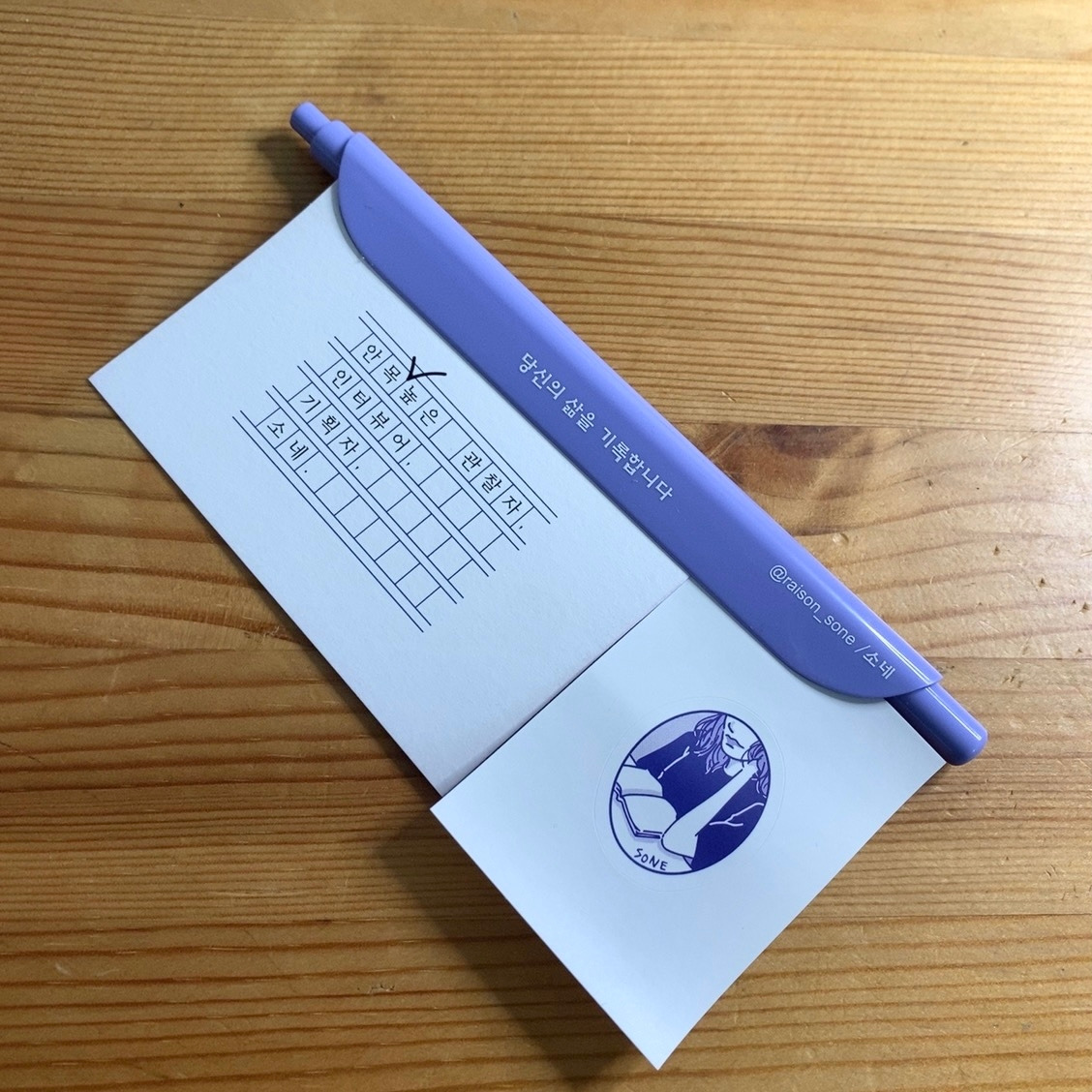 이 기세를 몰아 대전 프렐류드 문구점에서 만난 클립펜의 사용감이 좋아서 소량 주문제작을 맡겼다. 처음부터 계획해서 내세운 일이 아님에도 벌써 나만의 굿즈 상품이 3개가 생김으로써 '나만의 브랜드'가 색을 발하는 게 되었다.