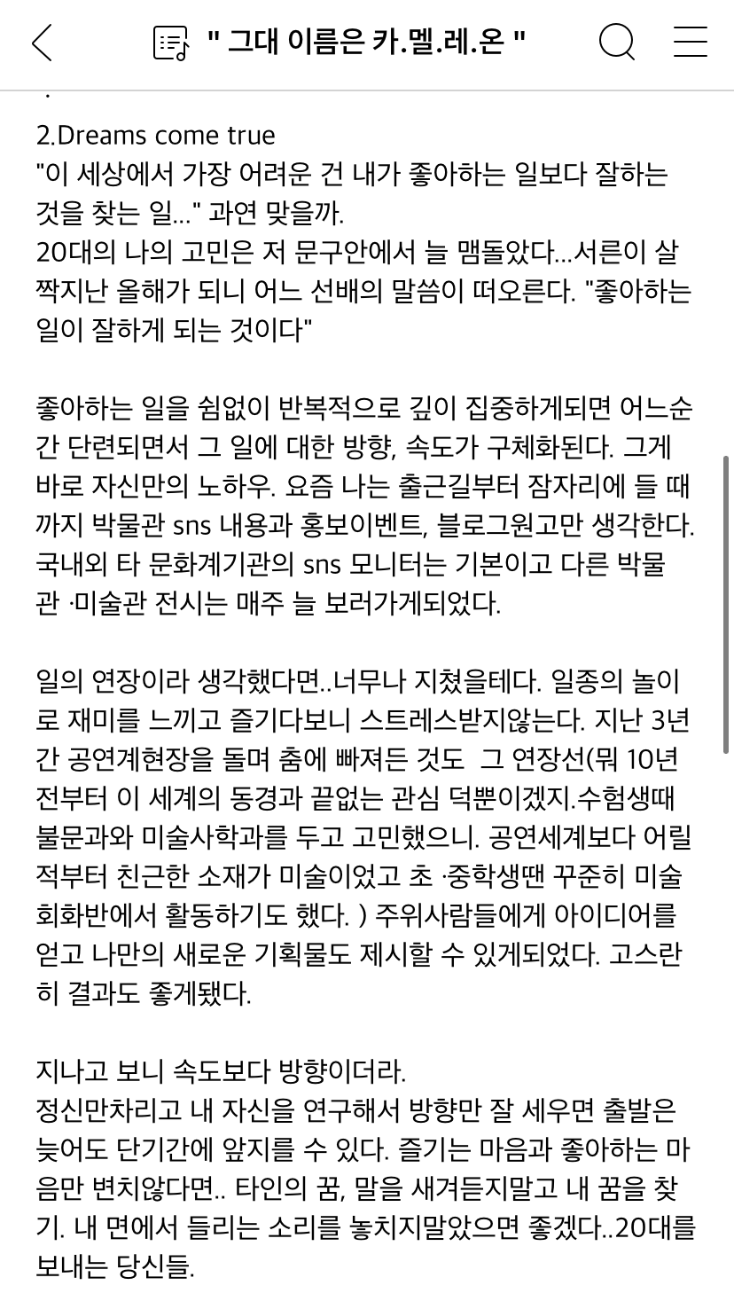 20대의 나의 고민은 저 문구 안에서 늘 맴돌았다... 서른이 살짝 지난 올해가 되니 인생선배이신 엄마가 보낸 문자가 떠오른다. "좋아하는 일이 잘하게 되는 것이다."
