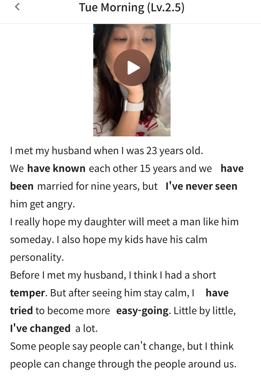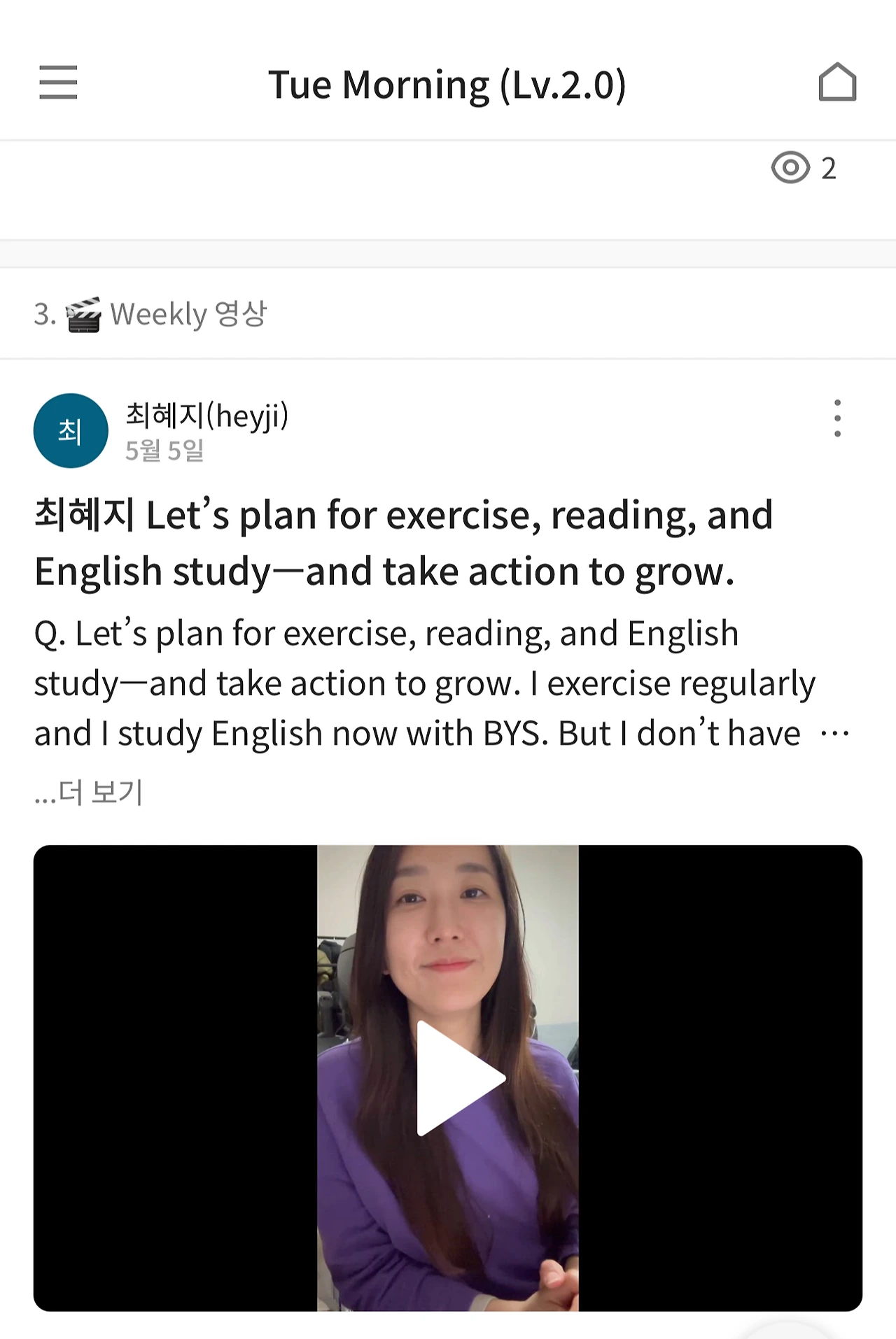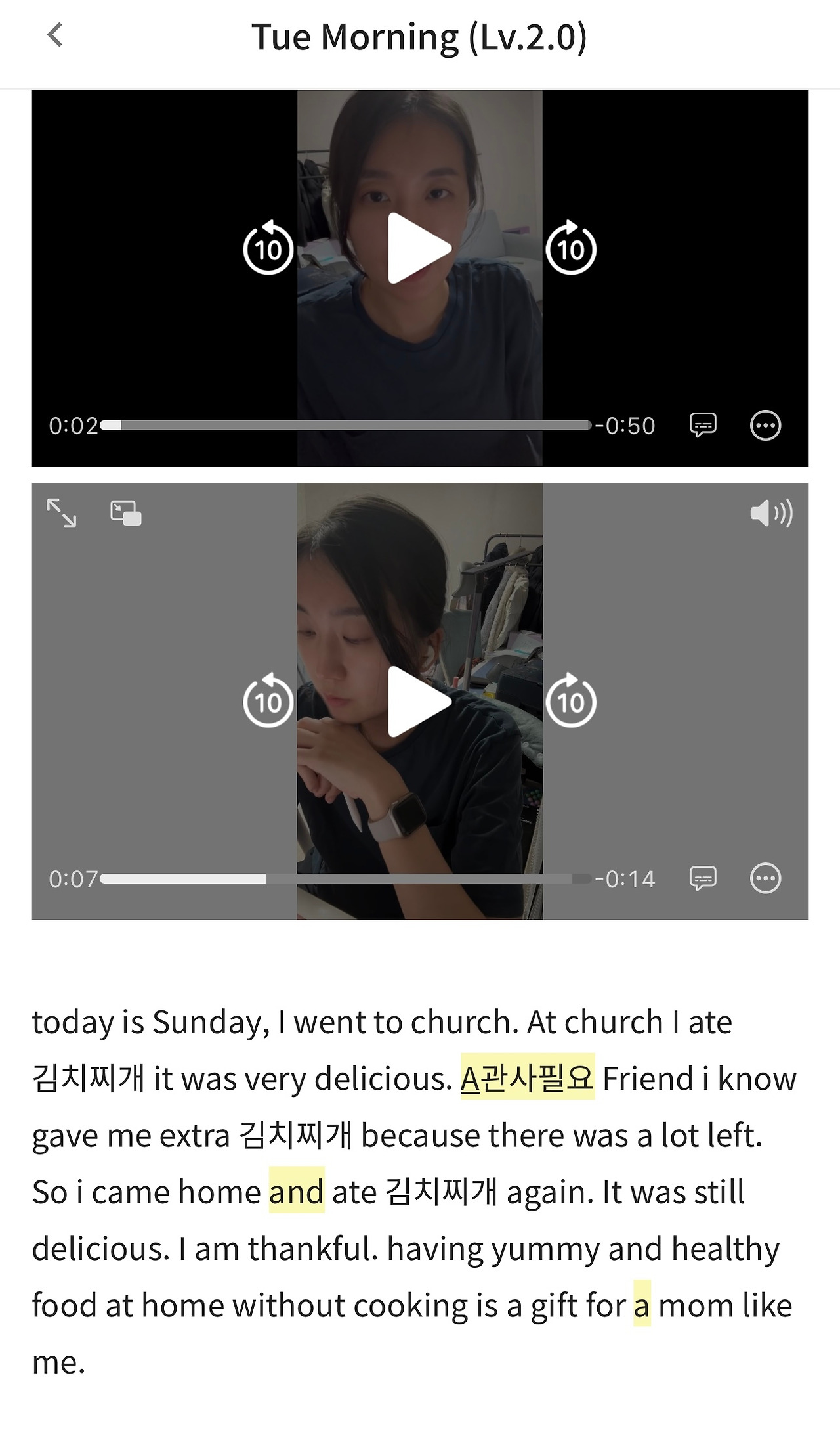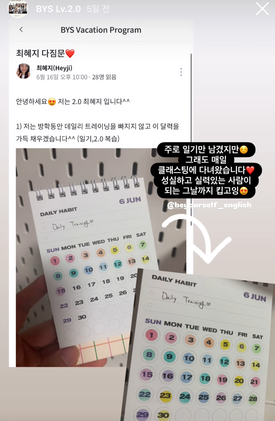데일리 트레이닝 - 매일매일 영어트레이닝을 한다. 영어 일기를 매일 녹화하고 공부하는 모습을 타임랩스에 담아 클래스메이트들과 공유하는 공간에 업로드한다.