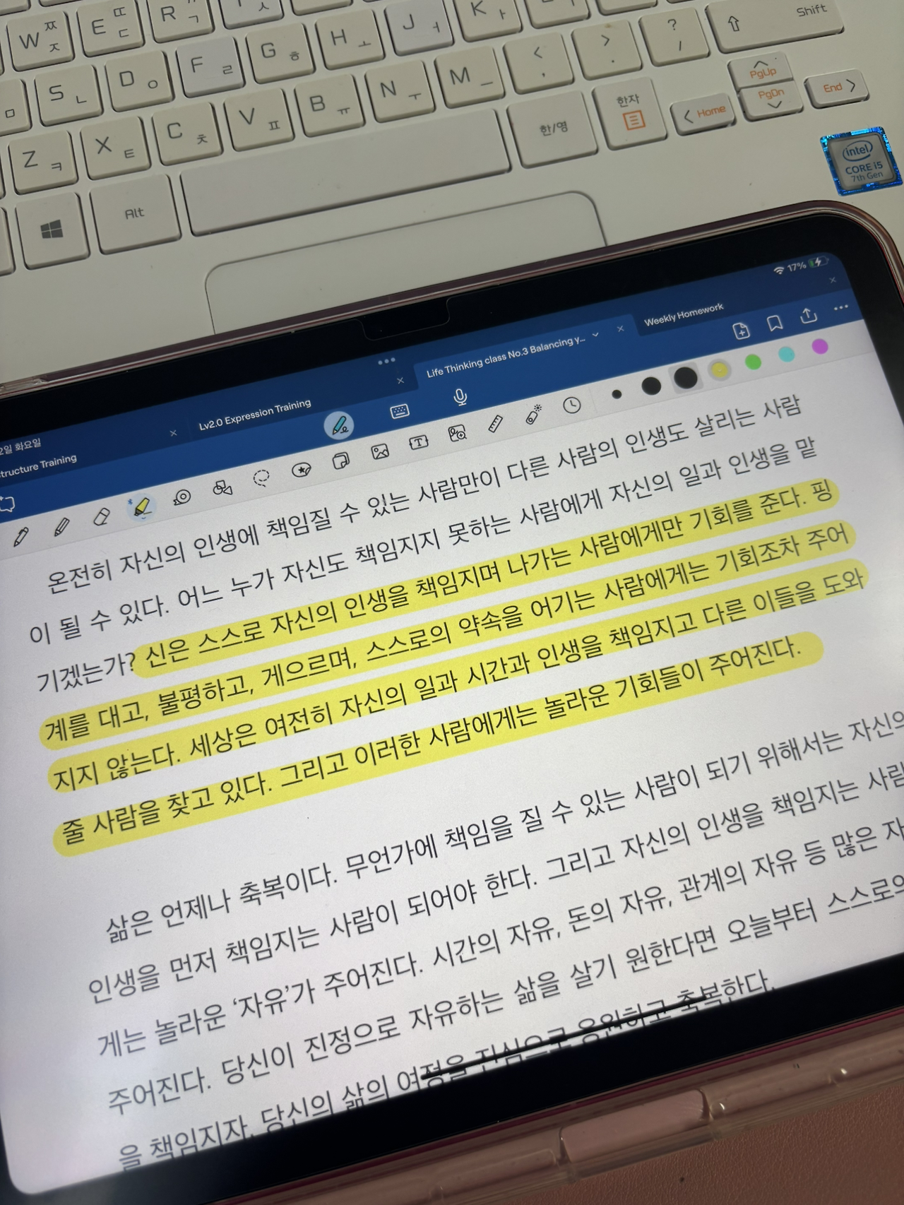 Be yourself를 통해 영어공부만 한 것이 아니라 나 자신에게 초점을 맞추는 연습을 하게 된 것 같다. 나는 누군가의 부속품이 아니고 나 자신이다. 그리고 누군가의 아내, 엄마가 아닌 내 스스로의 삶을 잘 살아갈 때 우리 가족은 더욱더 안정적이고 행복한 삶을 살아갈 수 있을 것 같다는 생각이 들었다.