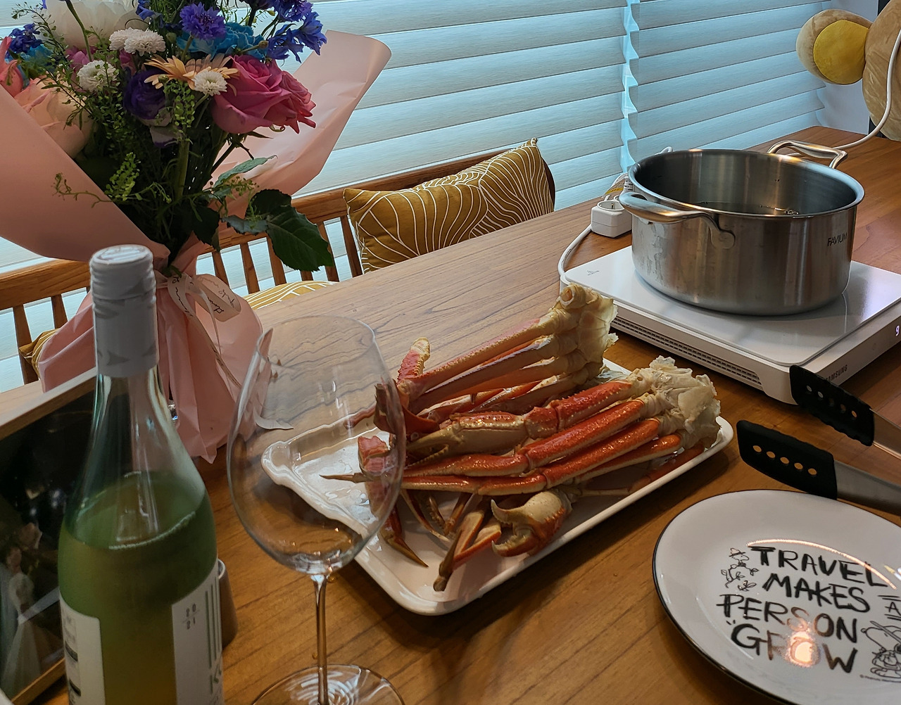 그래서 나는 냉동실에 늘 게를 쟁여 놓는다. 러시아 대게를 자숙 후 냉동해 파는 업체를 애용하는데, 엄청나게 큰 다리의 위용을 볼 수 있다. 식탁에 인덕션과 큰 냄비를 가져다 놓고, 게다리를 5개 혹은 10개씩 6~7분간 데쳐서 화이트 와인이랑 한입 먹으면 이게 사는 맛인가 한다.