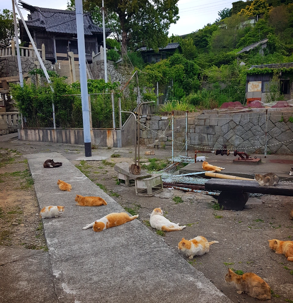 도착하자마자 선착장에서부터 고양이들이 여기저기 펼쳐져 있는 모습이 장관이다. 사교성이 좋은 녀석들은 달려와 머리를 부비기도 하고 배를 보여주기도 한다. 하지만 고양이들이 귀엽다고 지금부터 간식을 꺼내서는 안 된다. 섬의 환경과 그들 나름의 질서 유지를 위해 먹이를 줄 수 있는 공간이 정해져 있기 때문에 바로 이 공터에서만 줄 수 있다.