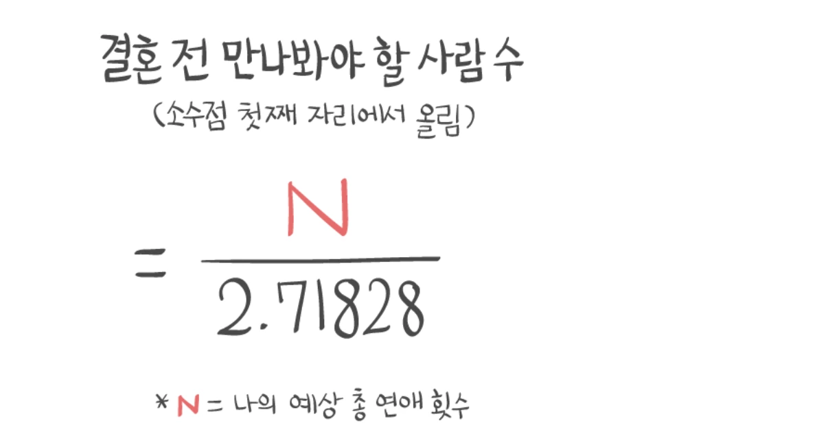 연애의 과학에서는 이런 재미있는 공식도 만들었다 (사진. 연애의 과학)회사는 연애라고 생각한다. 초, 중, 고 공부만 하고 대학생 때에도 공부를 하다가 세상에 나왔는데 어떻게 나에게 딱 맞는 회사를 알 수 있는가. 재미있는 통계가 있어서 공유해 본다. 클래식 프리매칭 사이트 안티싱글 조사에 따르면 결혼 전 절반 이상이 2~5명의 이성을 만난다는 재미있는 결과가 있었다. 무려 46%가 2~5명, 34%가 6명~10명이라고 한다. 앞으로 나와 평생 함께 할 사람을 만나기 위해서 이렇게 많은 이성을 만나는데 100세 시대 짧으면 1~3년 길면 10년 이상 일을 할 수도 있는 회사를 선택하는데 잦은 이직은 너무 당연한 것 아닐까? 이번 회사는 정말 잘 선택했더라도 다음 이직하는 회사에서 낚였다라는 생각이 들 수도 있다. 항상 "좋은"회사만 갈 수는 없을테니까.