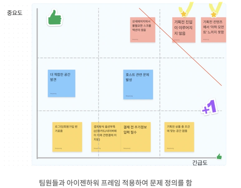 그 후 퍼널별 이탈 원인을 수집하였고 아이젠하워 프레임을 적용하여 긴급도, 중요도를 고려하여 우리 팀은 "기획전 발견/진입"단계에서 문제 정의를 시작했다. 기획전 진입이 이루어지지 않으면 뒷단이 아무리 매력적이더라도 최종 액션인 예약완료가 어렵다고 판단했기 때문이다
