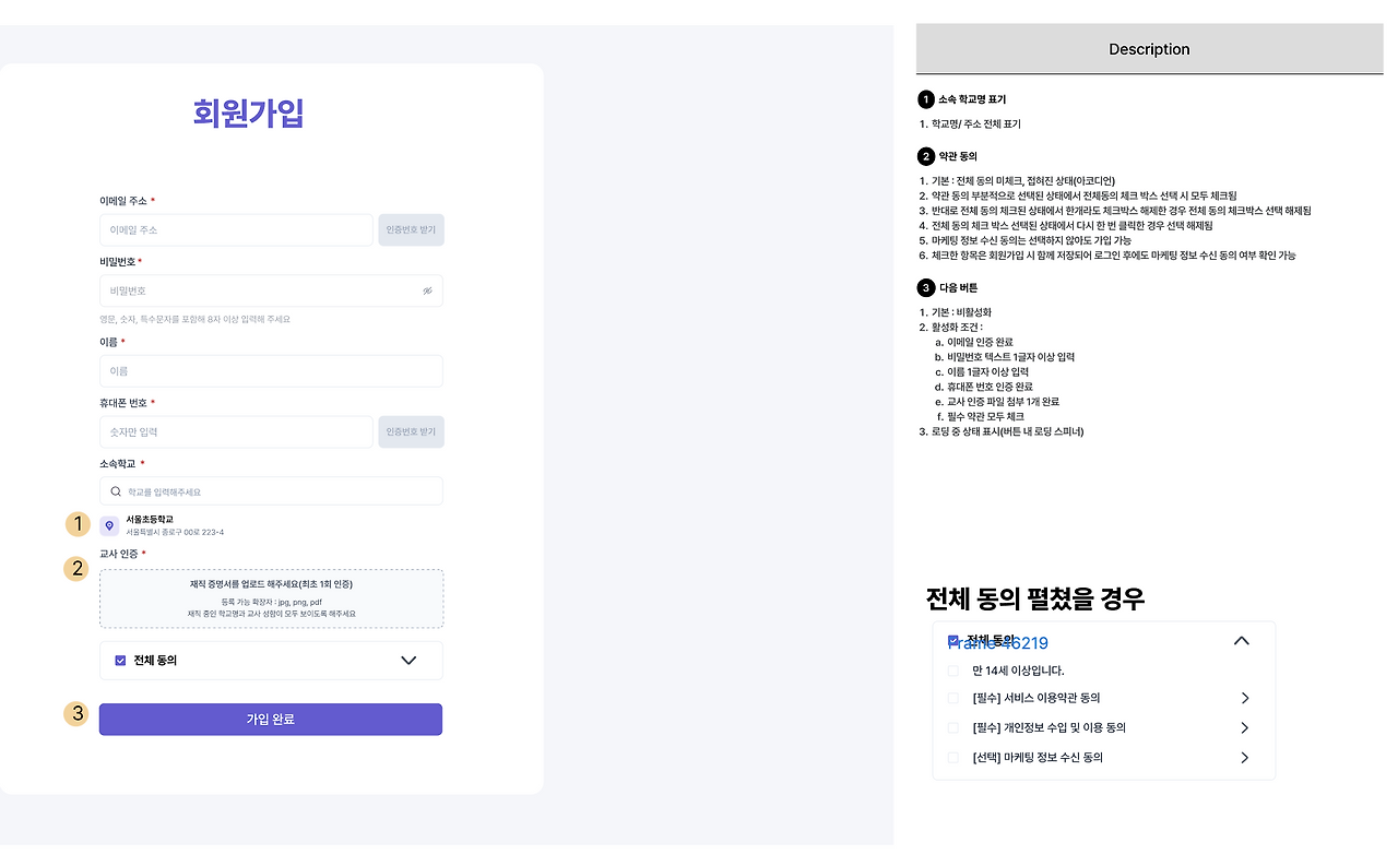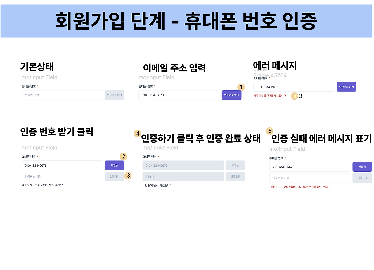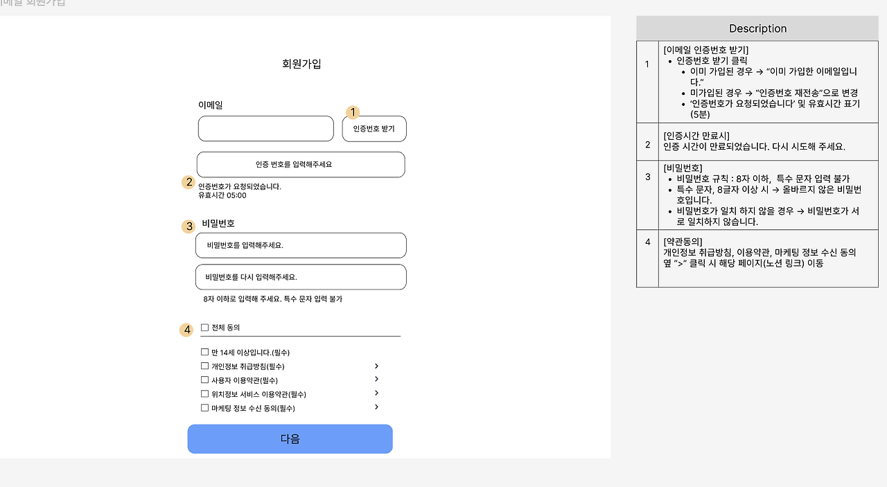 특히 이메일, 휴대폰 인증 단계가 있다면 이건 별도 페이지로 구성해서 각 액션 단계마다 UI와 함께 상세히 설명해야 한다.(이전에는 텍스트 몇 줄로 퉁쳤었...다)