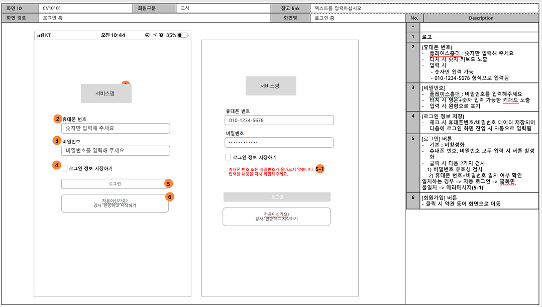 그리고 제일 중요한 부분! 왼쪽에 화면이 있고, 오른쪽에 Description이 있다. 이 모든 것을 포함한 문서를 화면설계서라고 한다. 쉽게 말해 "유저가 여기서 이걸 누르면, 서비스는 저렇게 반응해야 한다"를 그림과 글로 정리한 문서다.