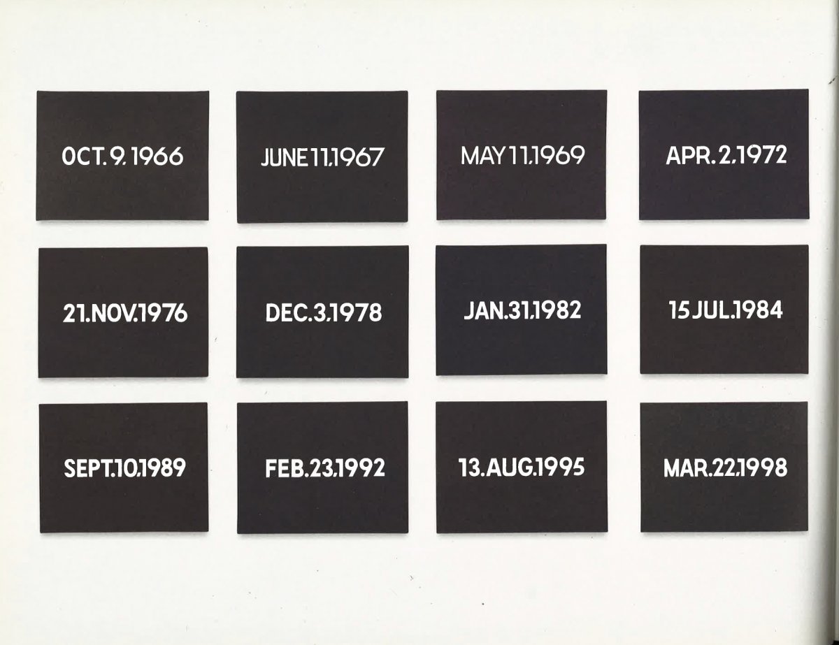 일본의 개념미술가 온 카와라(On Kawara)는 1966년 1월 4일부터 매일 날짜를 그렸다. 캔버스에 단색 배경색을 여러 번 칠한 뒤 그날의 날짜를 하얀 글씨로 그린다. 화폭엔 ’JAN. 4, 1966’ 같은 무미건조한 기호가 남는다. 연작 이름은 ‘오늘’. 온 카와라는 24시간 단위로 엄격하게 작업 시간을 끊었다. 4일을 그리던 중에 시간이 자정을 넘어 5일이 되면 만들던 작품을 폐기했다. 그렇게 50여 년 동안 날짜를 그려서 3천여 점의 ‘오늘’을 남겼다.