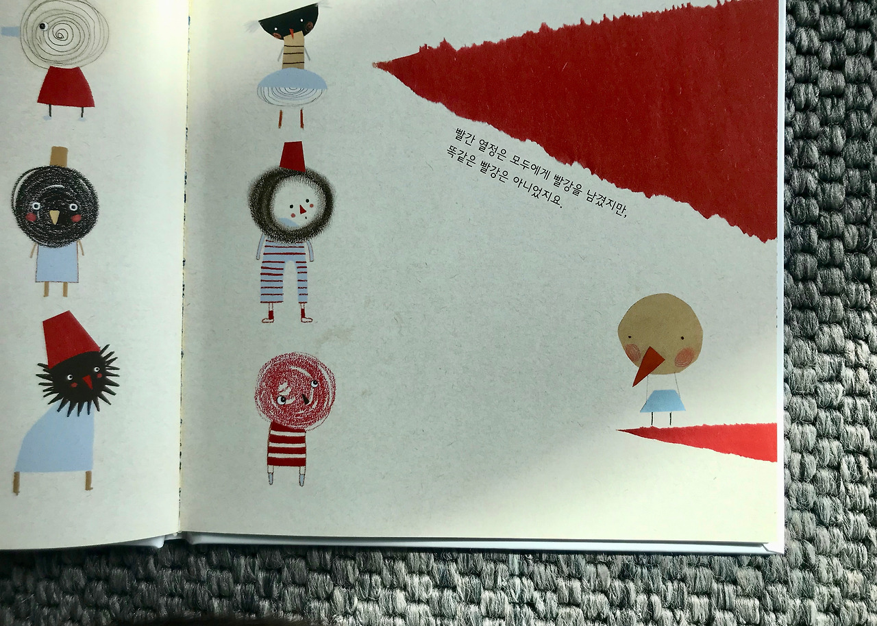 빨간 열정이 지나가고 난 뒤 어떤 동그라미는 빨간 코를 갖게 되지만, 다른 동그라미는 마름모꼴 빨간 모자를 갖게 된다. 다른 동그라미에겐 빨간 원피스가 남는다. 그렇게 저마다의 외양이 구체화된다.
