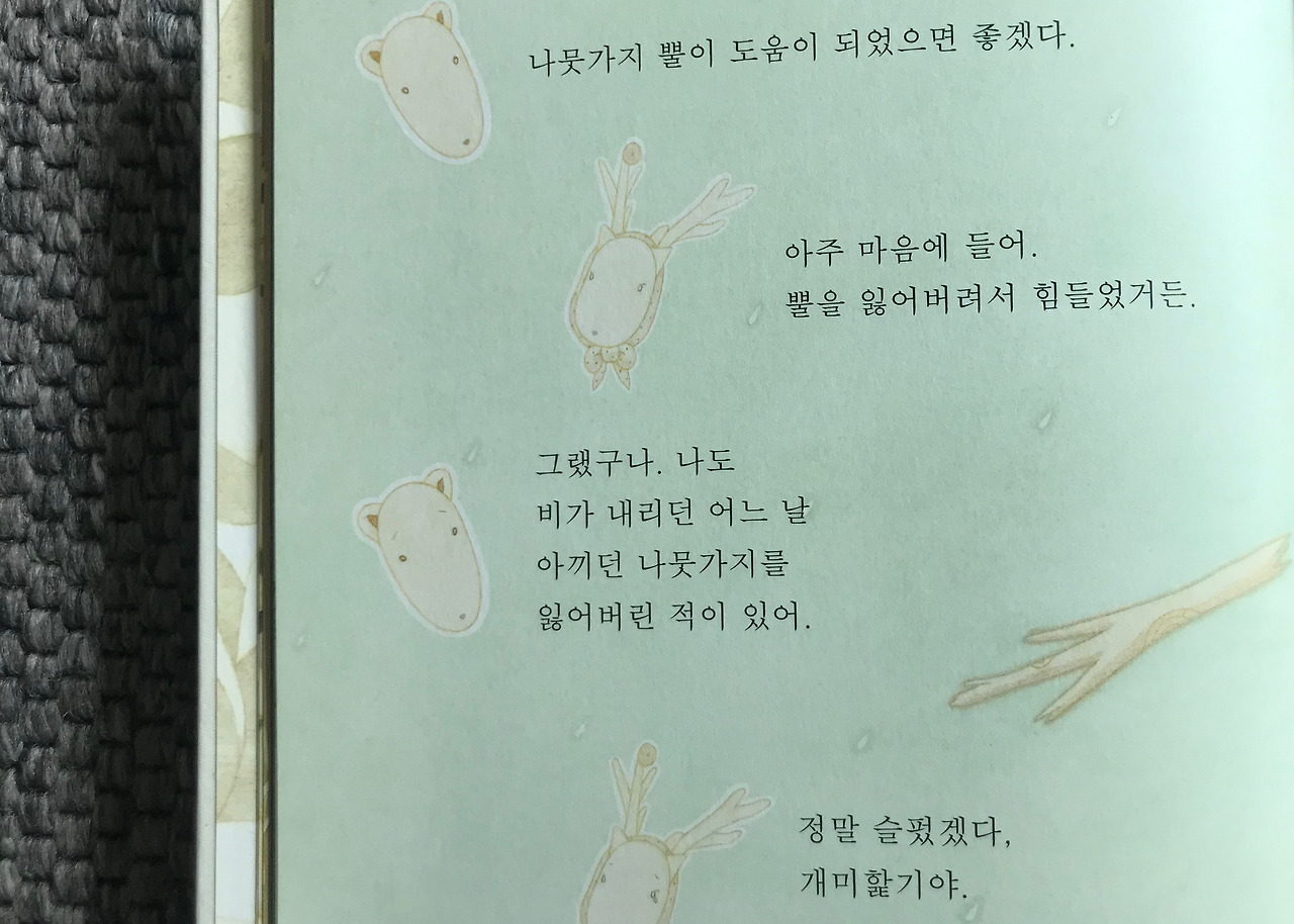 뿔을 잃어버려서 힘들다는 사슴의 말에 개미핥기는 답한다. "그랬구나. 나도 비가 내리던 어느 날 아끼던 나뭇가지를 잃어버린 적이 있어."