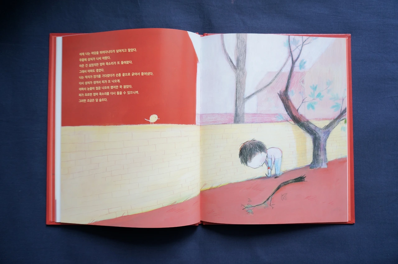 그러던 어느 날, 자신이 조금이라도 아프면 마음 안에서 엄마 목소리가 들려온다는 걸 알게 되고, 마당에서 넘어져 무릎에 생긴 딱지를 손톱 끝으로 긁어서 뜯어내기 시작합니다. 아픈 건 싫지만 그렇게 하면 엄마 목소리가 또 들려오니까 다시 상처를 내서 피가 나오게 합니다. 그렇게 해서라도 엄마를 기억하려 합니다.