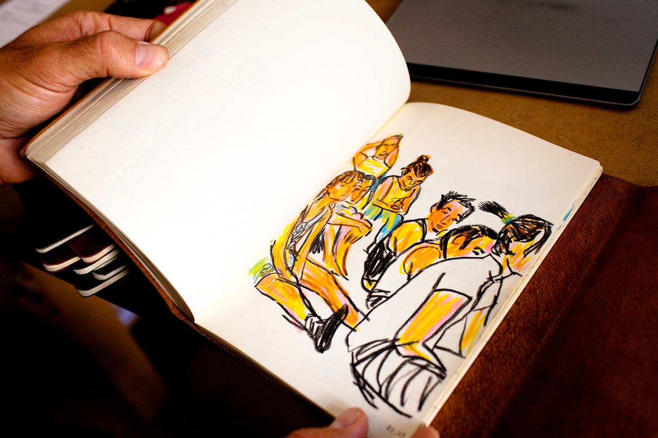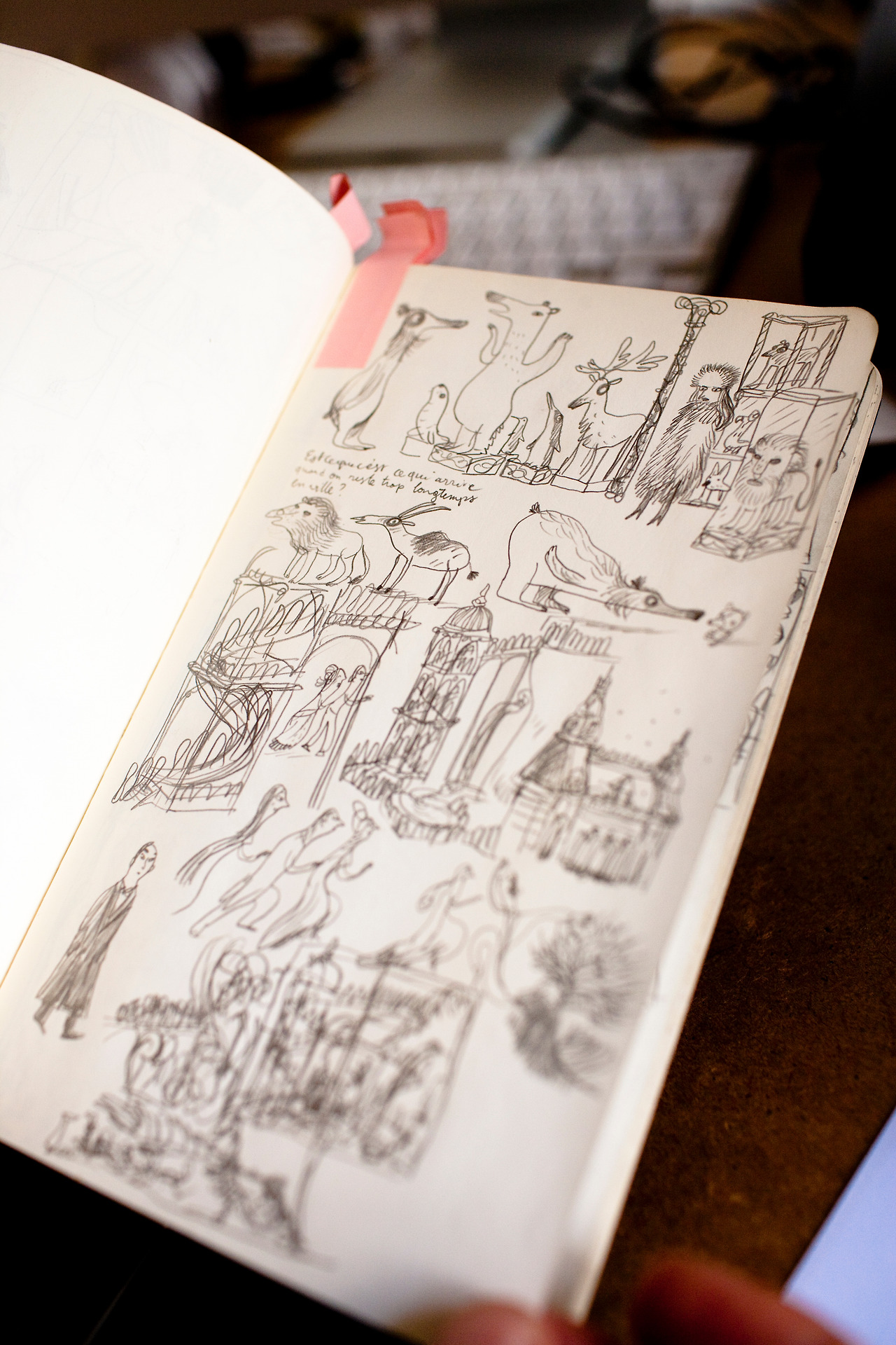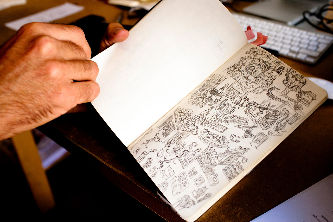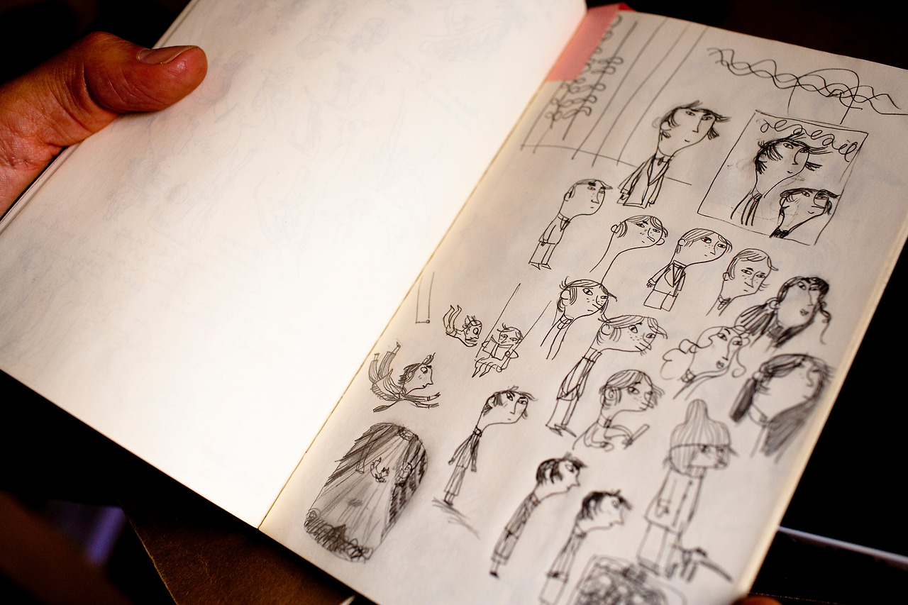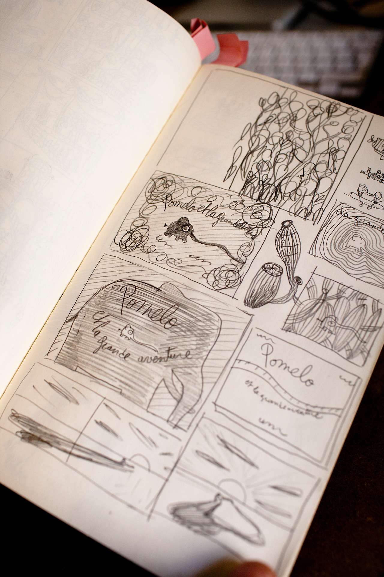 4시간 가까이 진행된 인터뷰와 촬영 중 가장 놀랍고 즐거웠던 순간은 벵자맹이 크로키 노트를 펼쳐 보여준 순간이었다. 얇은 샤프심으로 빼곡하게 면을 채운 그 노트를 보는데, 학창시절 모범생 반장 아이의 ‘빽빽이 암기 노트’가 기억 저편에서 소환되었다. 무언가를 외우기 위해 수없이 반복해 적어내려가는 그 수고로움이 그 안에 있었다. 벵자맹은 똑같은 사람 얼굴을 50번 반복해 그려보거나, 한 장면의 구도를 수십가지 버전으로 그려보면서 마음에 드는 것 하나가 나타나길 기다린다고 했다. 그렇게 찾아낸 하나를 다시 새 종이에 깨끗하게 그려서 책 안에 사용하는 것이라고. 그의 크로키 노트는 ‘마법’의 흔적이 아니라, ‘노동’의 흔적이었다.