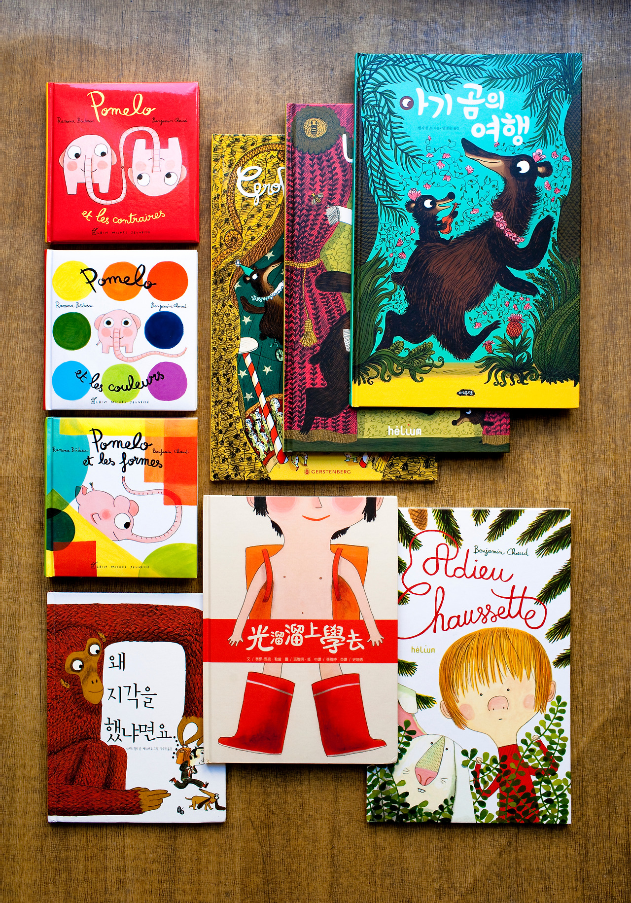 글 작가 라모나 바데스퀴와 13년째 협업하고 있는 시리즈 ‘뽀메로’. 몸집이 너무 작아 민들레 꽃 아래에 사는 코가 심하게 기다란 핑크 코끼리 이야기다. 작가가 유년기 때 가장 사랑했던 책이 핑크 코끼리가 주인공으로 등장하는 넬라 보스니아(Nella Bosnia)의 『Rose Bonbone』였다. 뽀메로 시리즈는 초창기에는 어휘와 개념, 말놀이 등을 알려주는 컨셉추얼한 책이었지만 최근에는 뽀메로가 더 넓은 세상을 여행하며 성장하는 서사 구조를 띈 책으로 바뀌었다. 시리즈 중 10권을 파인앤굿 출판사가 한국어판으로 출간했다.