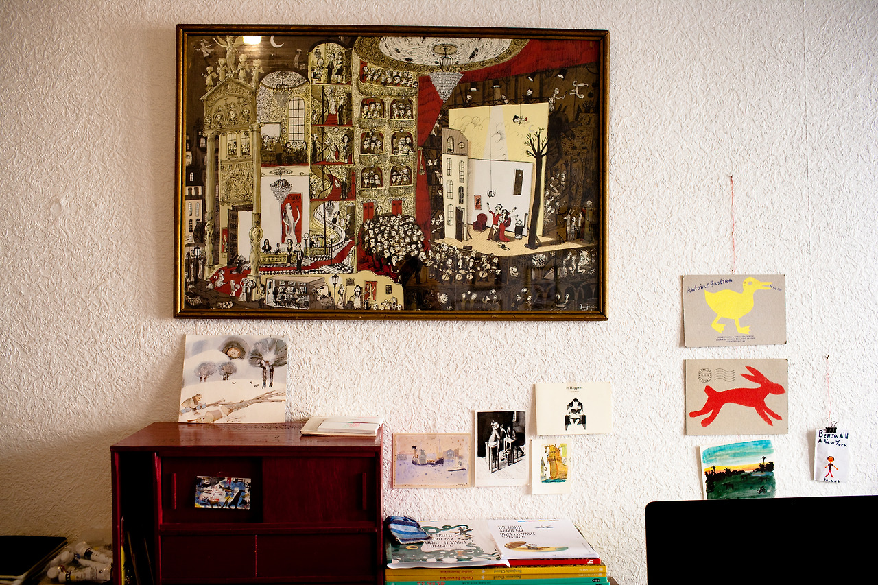 집으로 돌아와 그의 대표작이자 뉴욕타임스에서 2013년 ‘올해의 그림책’으로 선정한 『곰의 노래』를 찾아 보고 경악했다. 아기 곰을 찾아서 북새통 같은 도시 이곳저곳을 헤매고 다니는 아빠 곰의 여정을 담은 이 작품은 1990년대에 한국 가정집에 한 권씩 있었던 『월리를 찾아라』를 떠올리게 할만큼 엄청난 디테일로 도시의 풍경을 담아낸 책. 그의 다른 대표작인 『왜 숙제를 못했냐면요』 역시 참고 자료 없이 그렸다고 믿기엔 놀랄만큼 다채로운 디테일이 가득했다. 당시 내 머릿속 결론은 하나였다. ‘와, 어떻게 이걸 상상만으로 그려. 완전 천재네. 타고 났어.’