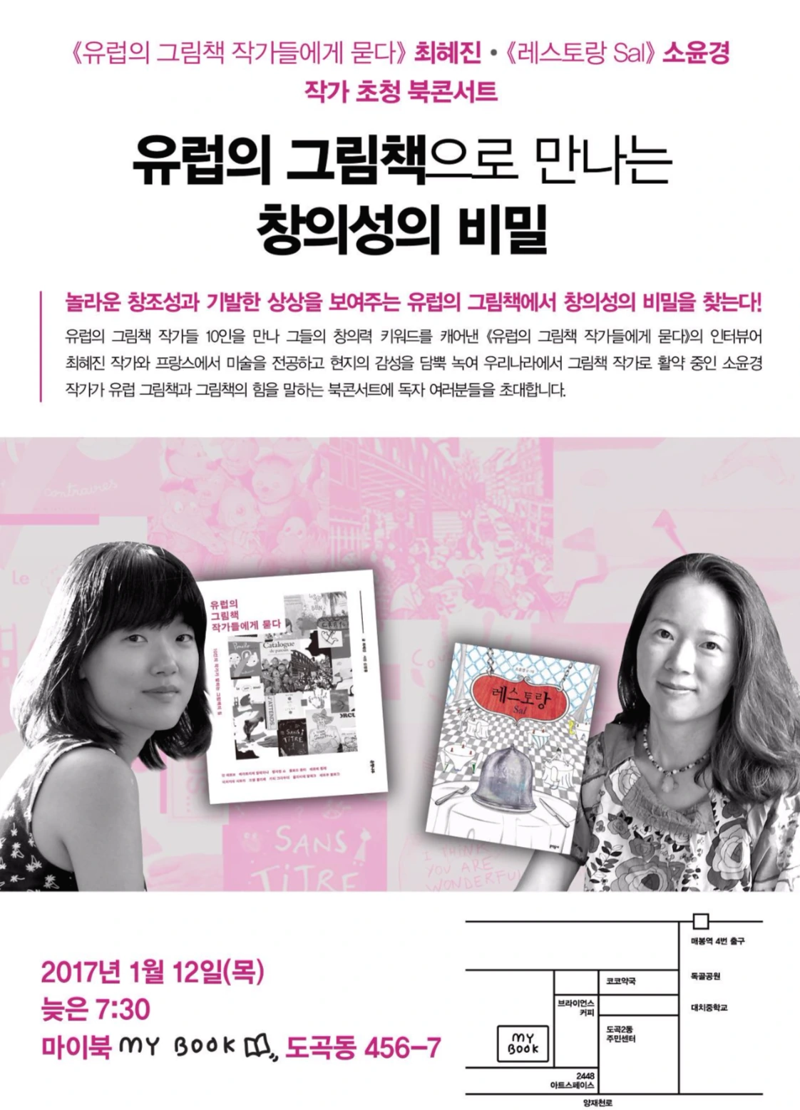 <레스토랑 sal><콤비>로 독창적인 작품 세계를 선보이셨던 소윤경 작가님과 함께 북 토크를 진행하게 되었습니다. 저는 창의성에 대한 고정관념을 깨준 유럽 그림책 작가님들과의 인터뷰 경험을 나눌 예정이고, 소윤경 작가님께서 말씀하실 주제는 무려 '악마적 상상력'이라고 해요! 정말 기대가 됩니다.