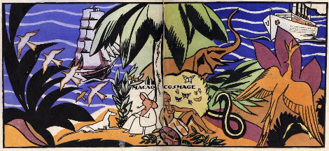 제1차 세계대전 직후인 1919년에 등장한 책 <마카오와 코스마주 Macao et Cosmage>는 그림책에 대한 기존의 관념을 완전히 전복시킨 혁신적인 작품이다. 이 책은 분명 기억할 가치가 있다. 작가 에디-르그랑(Edy Legrand)은 글자와 그림이 서로의 자리를 침범하지 않는다는 기존의 그림책 레이아웃을 깨고 글과 그림을 유기적으로 배치하거나 펼침면 효과를 적극 활용하는 대범함을 선보였다. 특히 이 책은 1920년대 무렵 유행했던 인상주의, 아르데코 등 당대 회화 예술의 다양한 요소를 그림책 안으로 소화시켜 어른 독자들에게도 시각적 포만감을 잔뜩 선사한다.