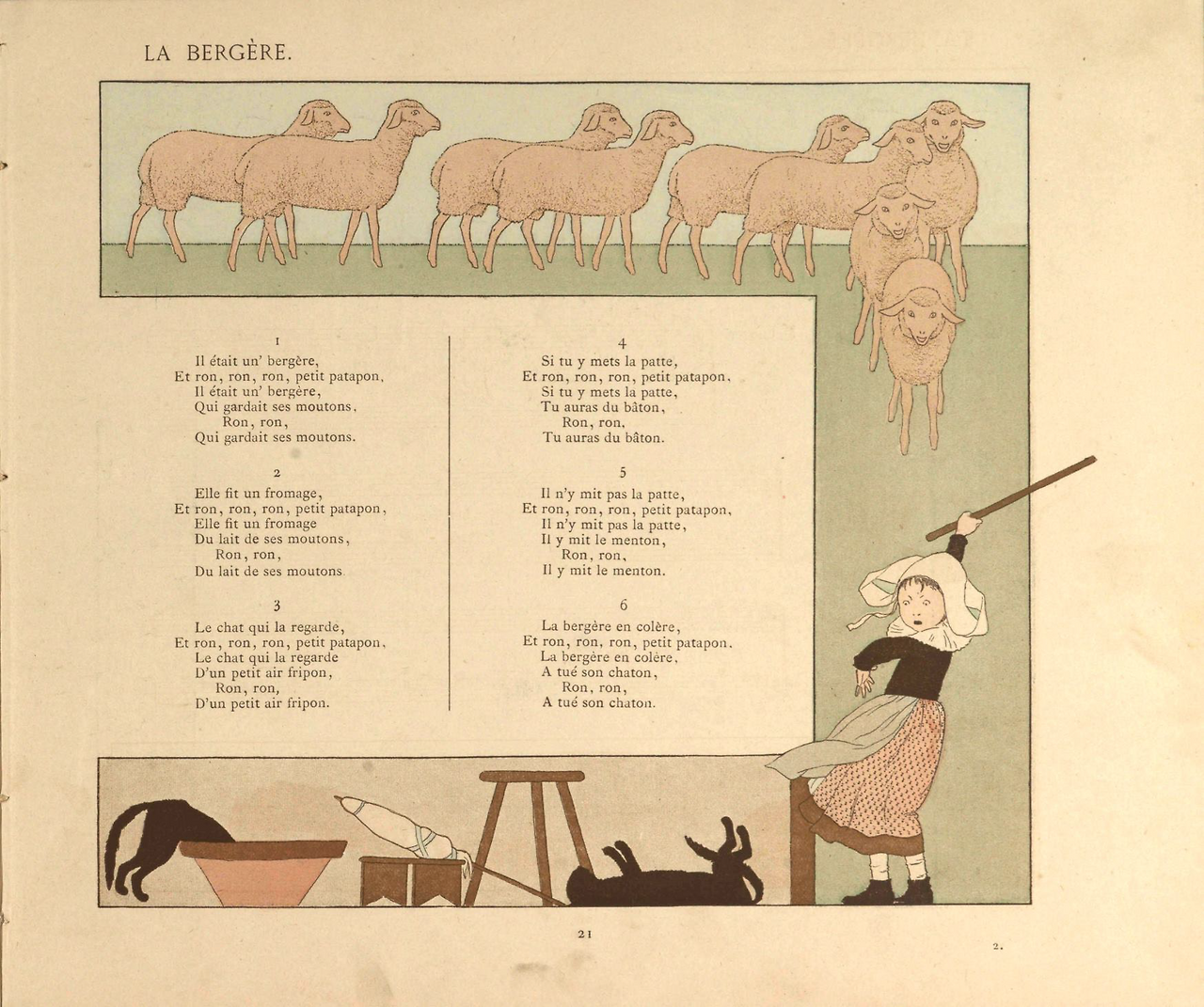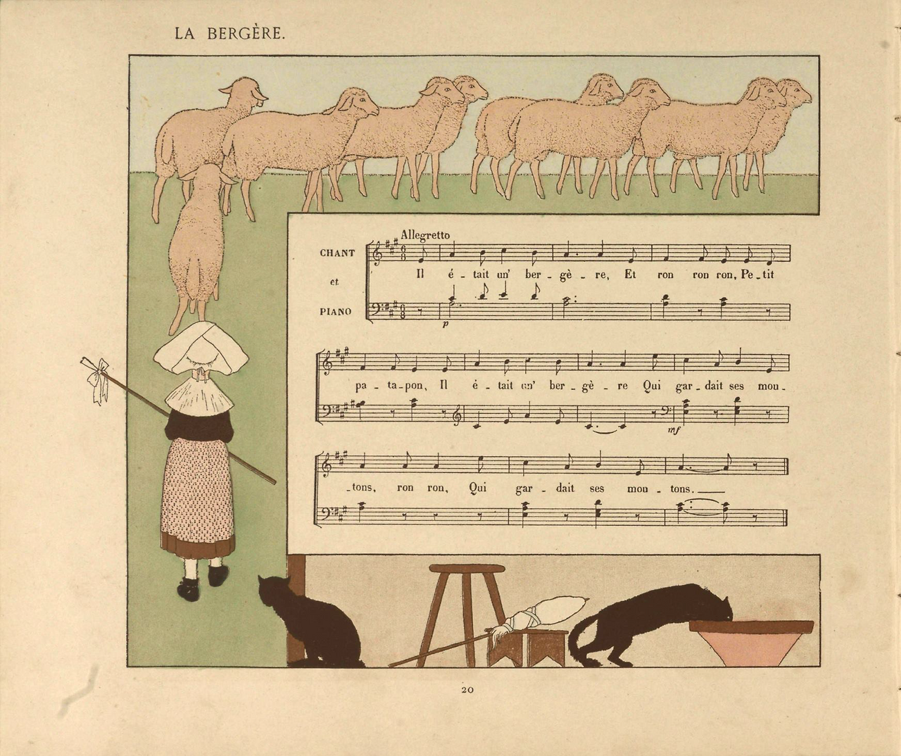 1880년대에 들어 모리스 부테 드 몽벨(Maurice Boutet de Monvel)같은 뛰어난 화가가 어린이책 작업에 뛰어들면서 프랑스 아동 도서의 판형과 주제가 눈에 띄게 다양해졌다. 부테 드 몽벨이 만든 <어린이를 위한 옛 노래와 원무곡 les Vieilles chansons et rondes pour les petits enfants> 악보집은 지금 봐도 그 현대적인 그래픽에 입을 다물기가 힘들다.