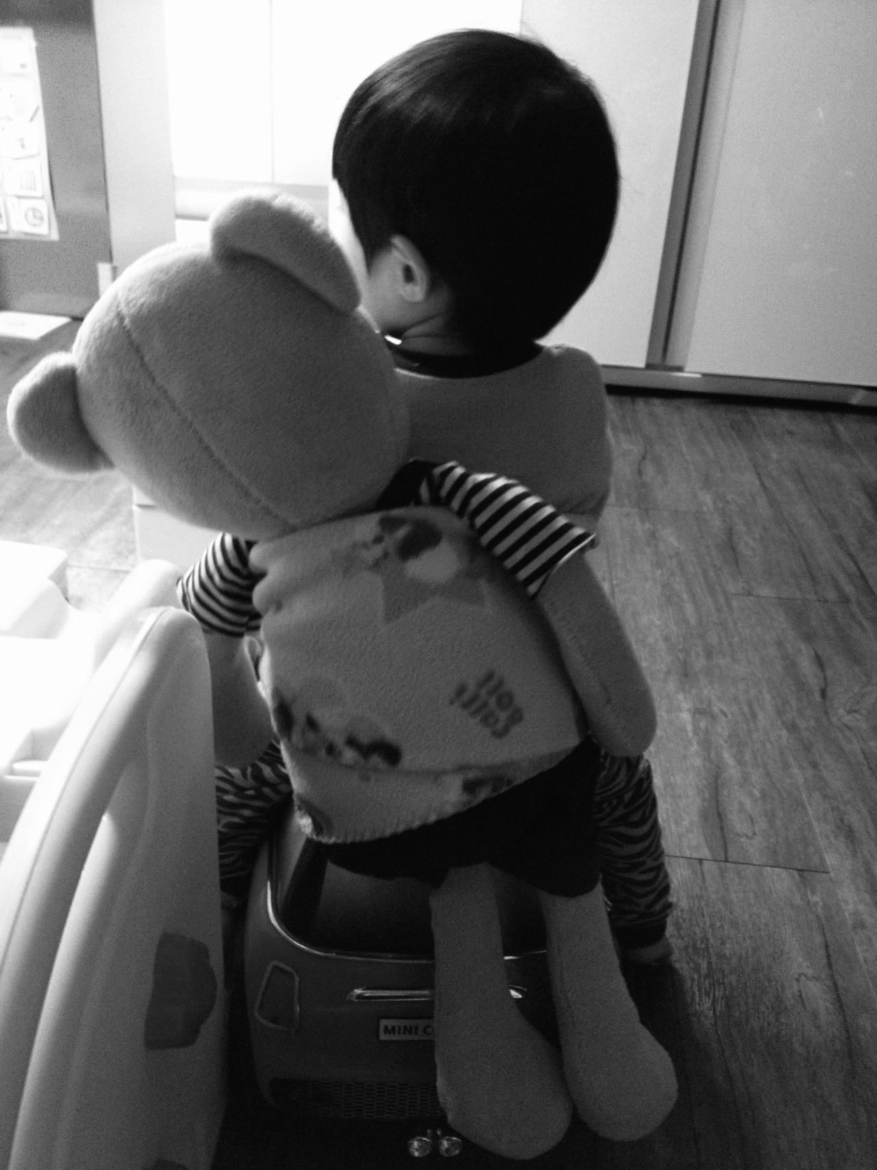 그렇게 외할머니의 등에 안겨 잤던 꼬꼬꼬마 아기 시절을 기억하는 걸까. 자기도 엄마 흉내를 내보려고 했던 걸까. 한번은 자신이 아끼는 작은 담요를 들고 와 애착 인형, 곰동이를 업어달라고 주문을 했다. 원하는 대로 아이 등에 곰동이를 놓고 가슴팍에 분홍색 담요를 휘감아 매듭을 지어주었다. 그랬더니 한 바퀴 휘~ 돌며 손가락으로 빙빙 돌려가며 하는 말.