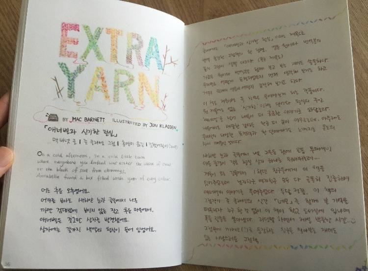 국내에선 「애너벨과 신기한 털실」이라는 제목으로 번역 출간된 그림책의 한 장면. 영문 원서와 번역본의 표지 그림이 살짝 다르다. (물론 제목도) 가끔은 원서와 번역본을 함께 놓고 보는 재미도 쏠쏠하다. 우리말로 어떻게 표현되었을지 먼저 생각해 보기도 하고, 거꾸로 원래의 영문이 어떤지 짐작해 보기도 한다.