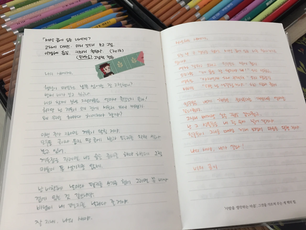 난 너한테 날마다 편지를 쓰기로 했어. 그러면 꼭 네가 곁에 있는 것 같으니까.