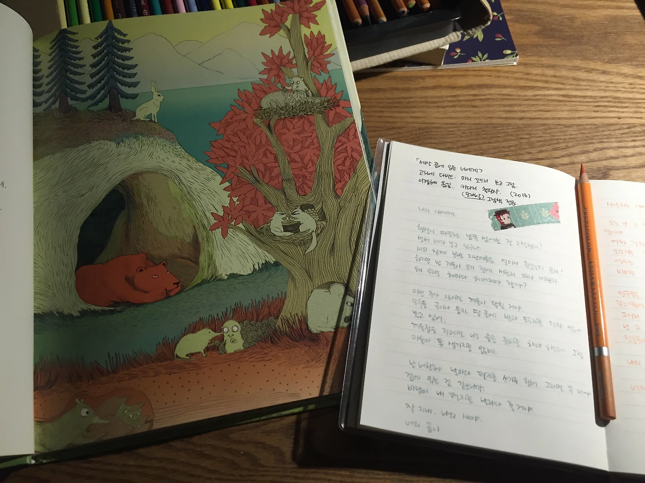 따뜻한 남쪽으로 떠난 짝꿍 새가 그리워 편지를 쓰기 시작한 곰의 이야기를 담은 그림책 [세상 끝에 있는 너에게].