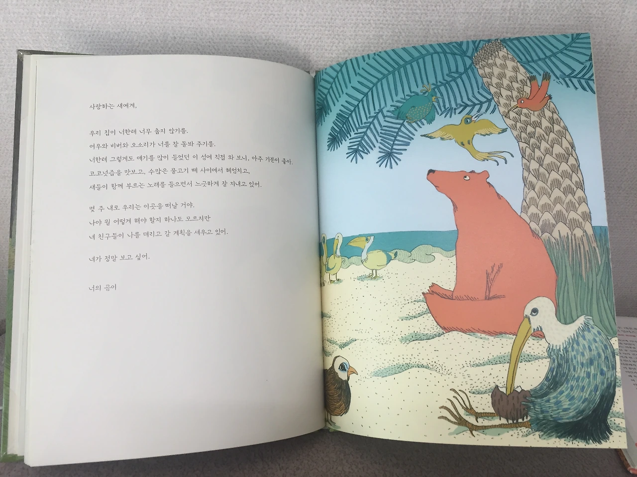 매일 새에게 말하듯 편지를 건네던 곰은 어느 날 큰 결심을 합니다. 세상 끝에 있는 새를 찾아가기로 말입니다. 이야기는 편지글 형식으로 새를 만나러 가는 여정이 그려져 있어요. 그림 하나만으로도 풍성한 이야기를 담고 있지요.