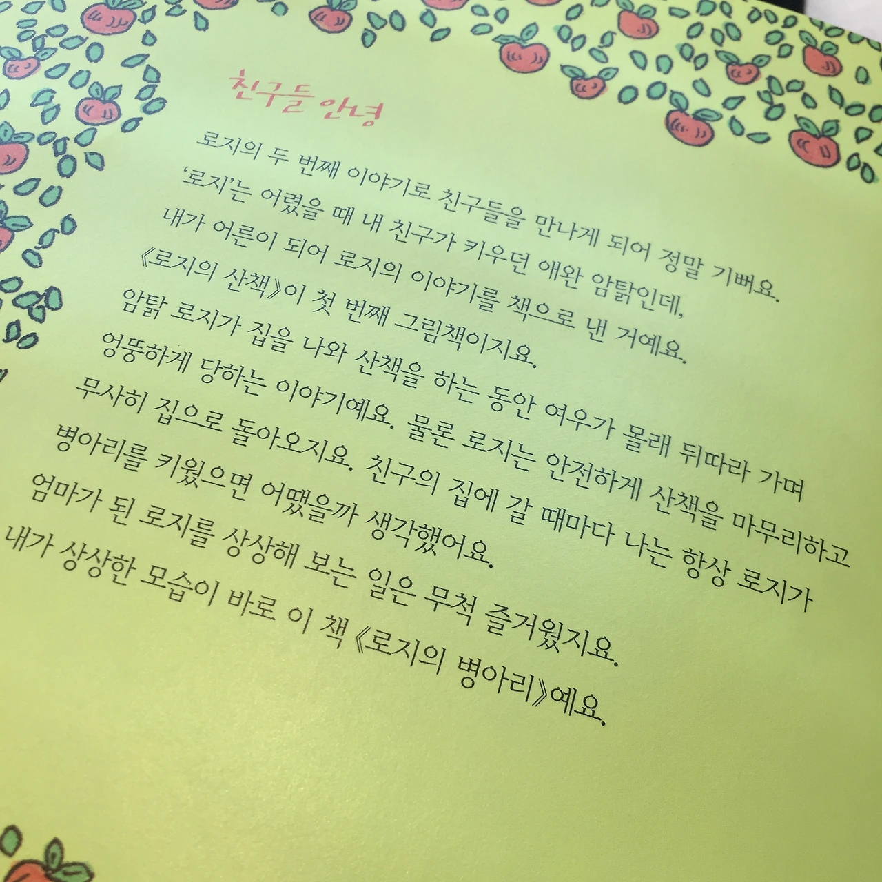 그래서인지 책 말미에 작가의 말이 두 페이지에 걸쳐 수록되어 있는데, 무려 48년 만에 로지를 귀환한 작품이기도 하고 엄마가 된 꼬꼬닭 로지의 이야기를 다루었기에 작가가 더 각별하게 여기지 않았을까 싶다.