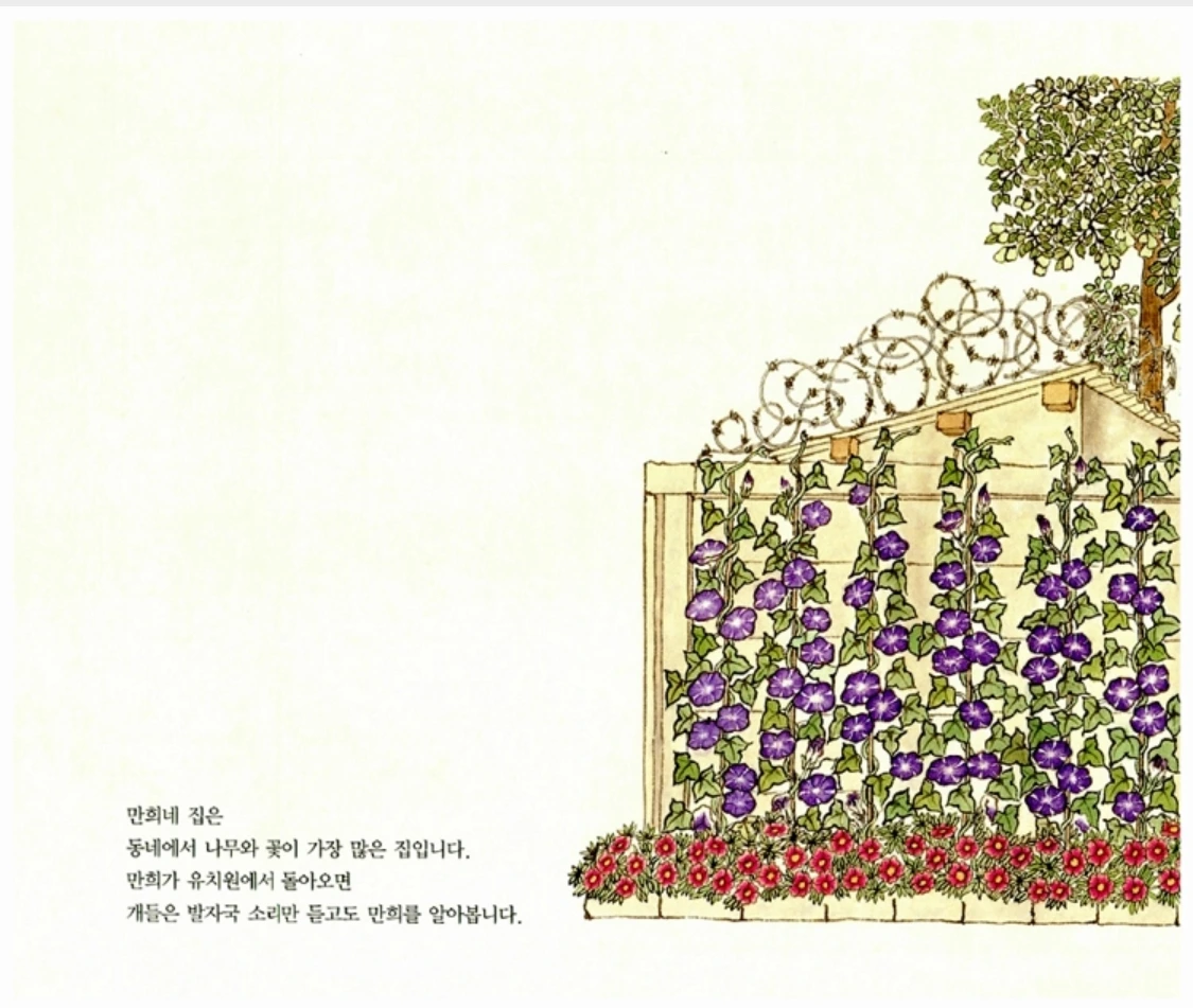 ‘만희네 집은 동네에서 나무와 꽃이 가장 많은 집입니다’라는 글로 시작하는, 우리 그림책의 고전, 권윤덕 작가의 [만희네 집](길벗어린이, 1995)은 책을 펼치자마자 보이는 면지부터 자세히 봐야 한다. 서사가 시작되고 끝나는 앞뒤 면지를 보면 나팔꽃이 그득하다. 온통 보라색 면지에 빽빽하게 들어찬 나팔꽃을 마주하고 어찌나 반가웠던지 모른다. 꽃이 비슷하게 그려진 것 같지만 전혀 그렇지 않다. 같은 줄기에도 각자의 시간이 다 다른 꽃의 세계가 있다. 자세히 들여다봐야 보인다. 이야기의 프롤로그와 에필로그의 기능을 하는 이 장치는 시간의 흐름을 이야기의 큰 축에 놓고 설정한 권윤덕 작가님의 세계관을 느낄 수 있는 대목이기도 하다.