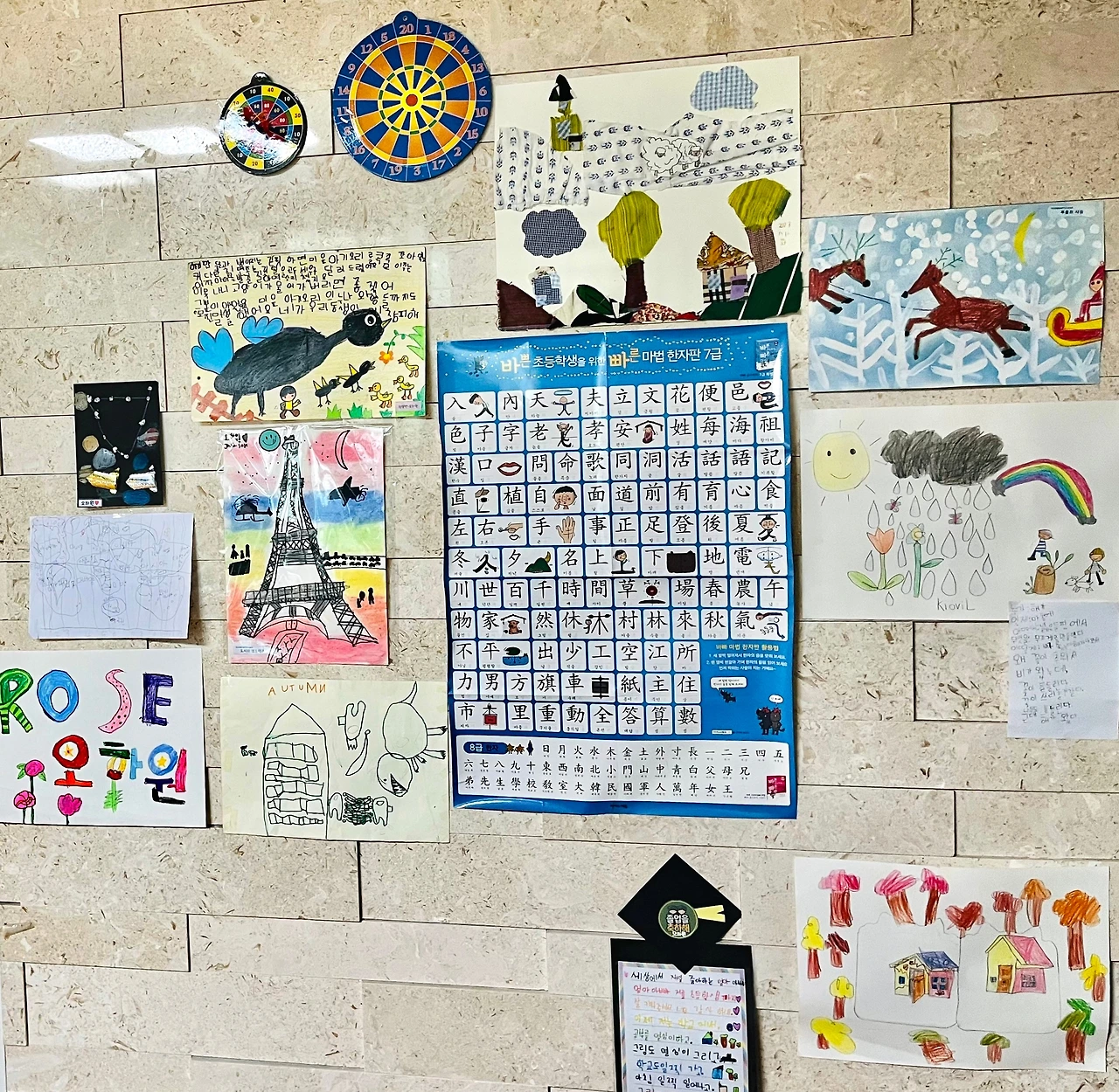 우리 집 거실 벽면 한쪽에는 아이들의 유년 시절에 그린 그림 컬렉션이 있다. 한글에 막 눈을 떴을 즈음, 글자를 그림처럼 그리면서 ‘ㄹ’을 좌우 반전으로 쓴 단어가 들어간 토막글과 크레파스로 빈틈없이 색칠한 그림, 노을 지는 에펠탑, 무지개와 구름과 비와 꽃 그림에 어우러진 짧은 시 같은 글, 아이 머릿속에서 끄집어내어 그려본 미지의 세계지도, 천체망원경과 지구 달 그림, 한 어린 영혼의 손이 이끈 자유로이 뻗어나가는 선의 흐름이 아기자기한 드로잉 등…. 온통 아이들 어린 날의 순수, 때 묻지 않은 고유한 감성, 다시는 돌아갈 수 없는 그때의 유일무이한 작품인 셈이다. 이제는 부모와 함께 있기보다는 또래를 찾고, 자신만의 독립된 공간을 찾아 자꾸 부모의 품에서 떠나려는 아이들은 알까. 벽에서 떼어 내기도 아쉽고, 점점 바래져가는 종이가 안타까운 나의 마음을.