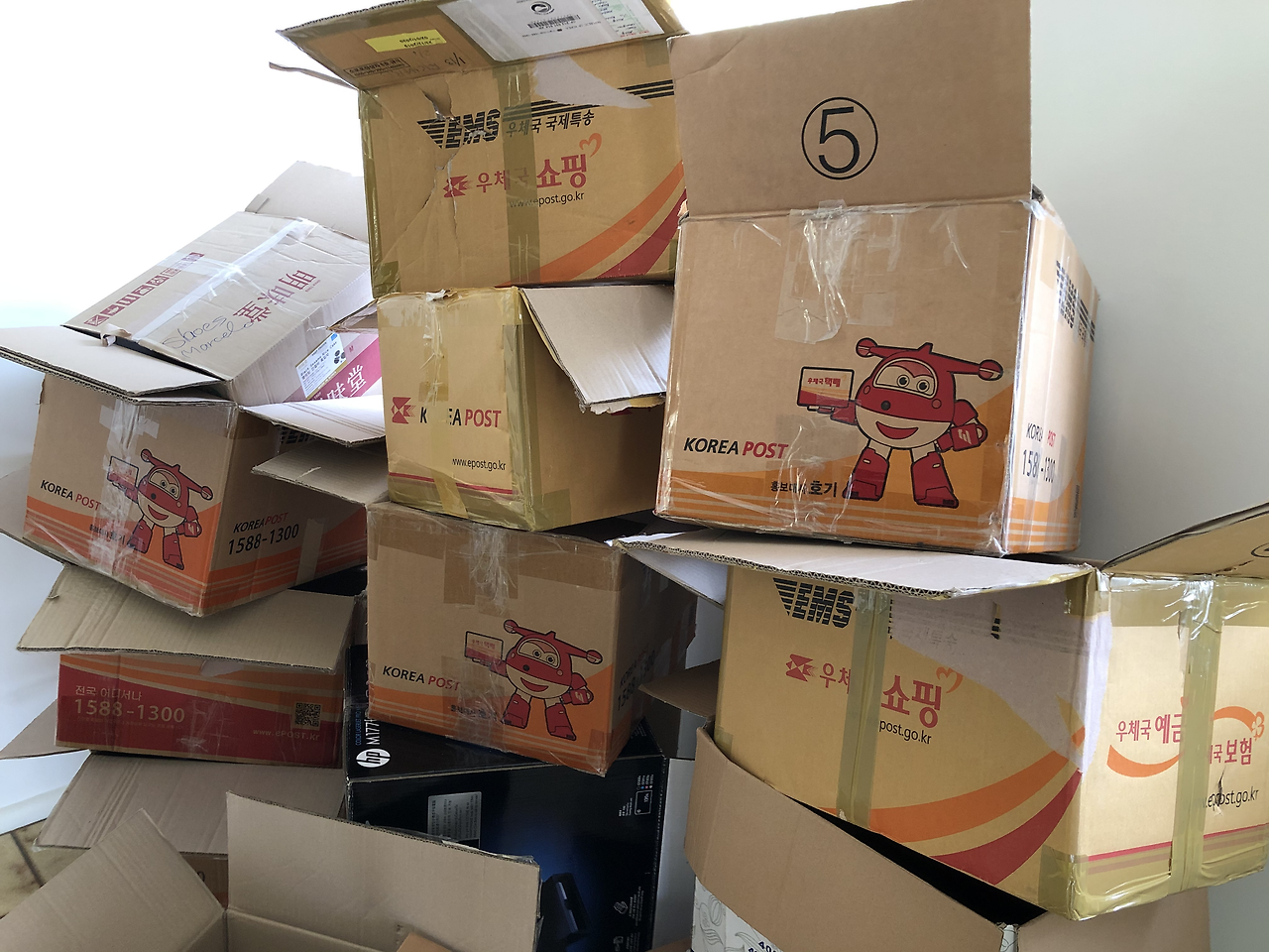 짐을 쌓다 보니, 모든 박스가 한국우체국에서 만들어진 것이다. 모두가 뭘 얼마나 한국에서 받아서 쓰는지 가늠이 안된다. 물어보니, 모두가 친정 엄마들이 바리바리 주기적/간헐적으로 배로 보내온다고 했다. 먹고, 입고, 바르고, 사용할 수 있는, 보낼 수 있는 것들이면 거의 모두 온다고 했다.