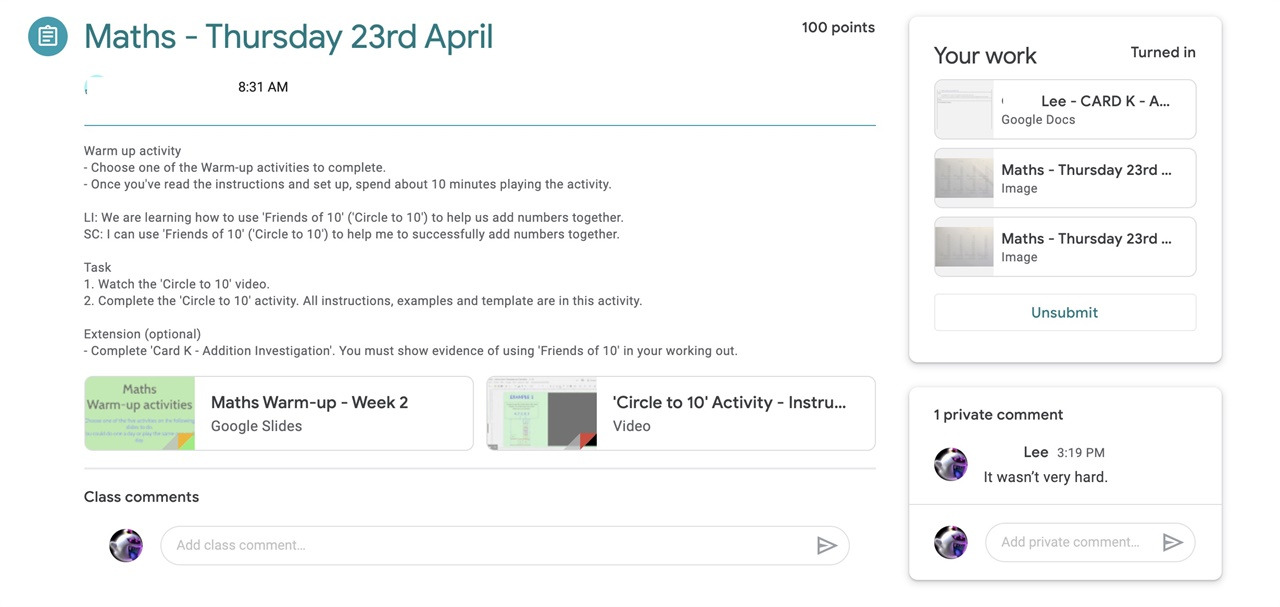 ▲ 구글 클래스룸을 통한 과제 제시와 제출과 소통 아침 8시쯤 부터 담임은 구글 클래스룸에 하루의 일과와 과제를 올리기 시작한다. ⓒ 이혜정