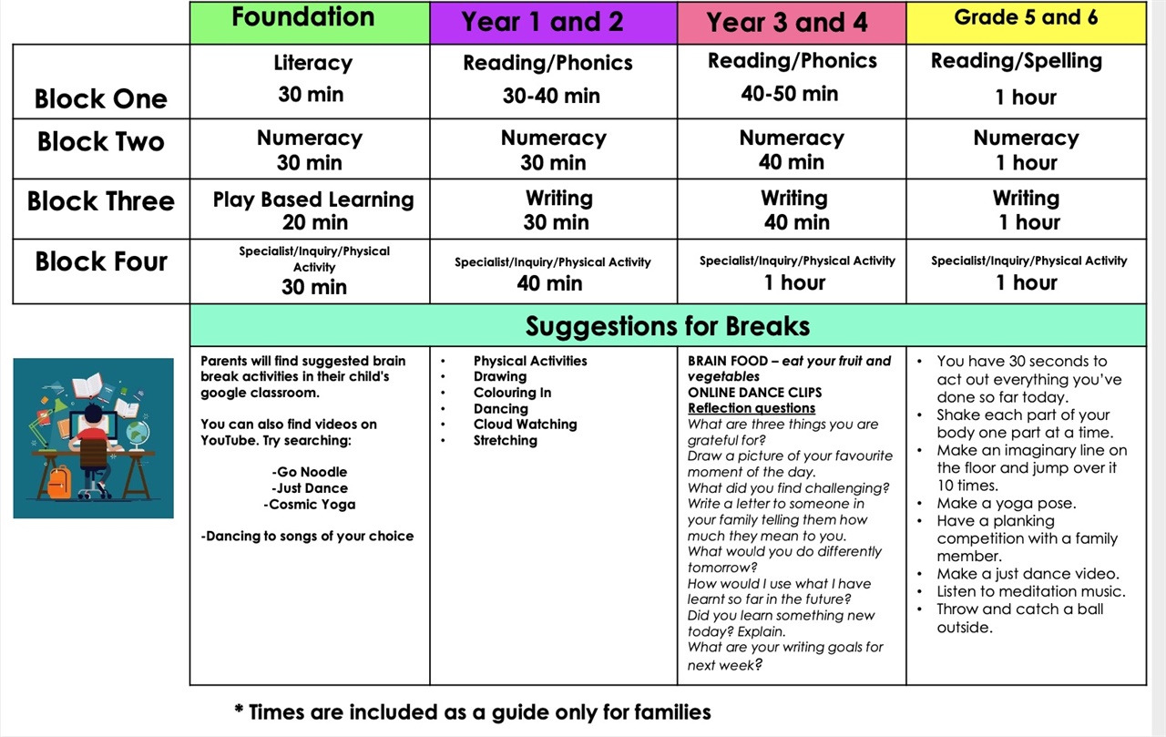 ▲ 호주의 온라인 수업을 위한 블럭형 시간표 온라인 수업으로 고생하는 학부모를 위해 교장이 참고용 시간표를 보내줬다. ⓒ 이혜정