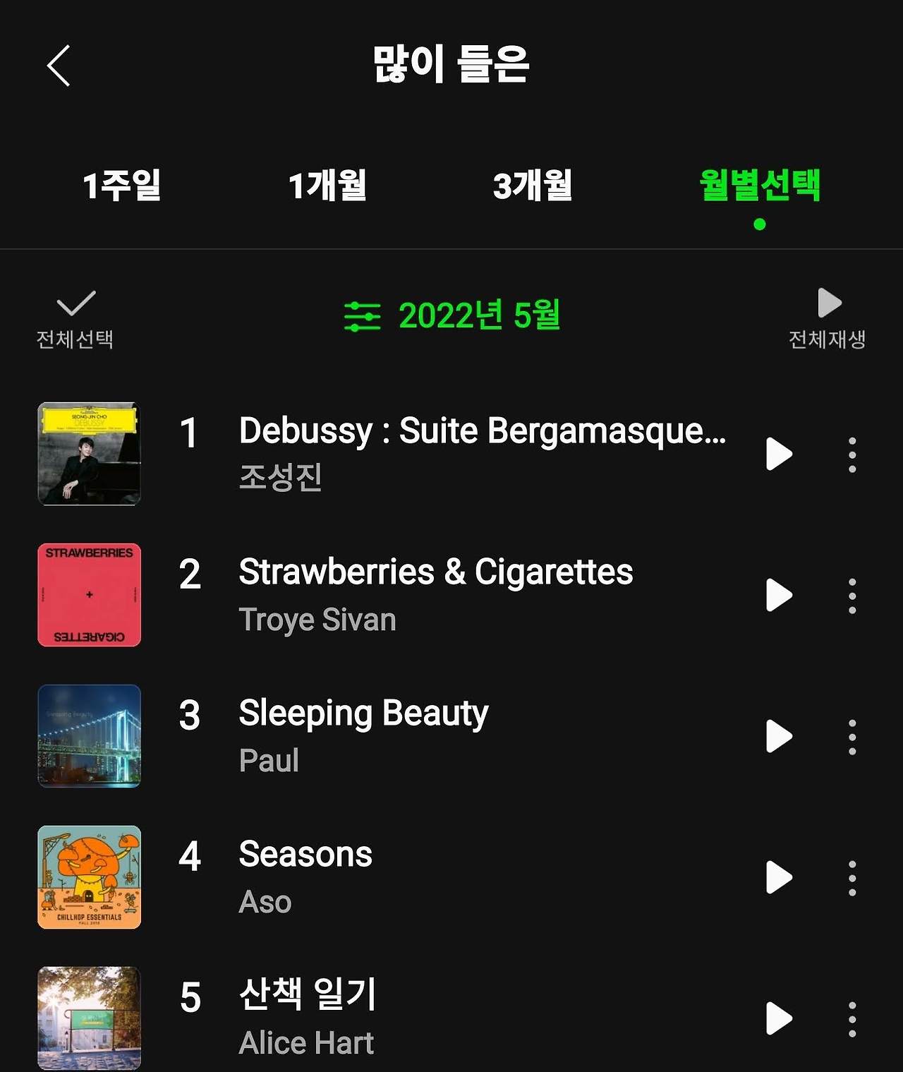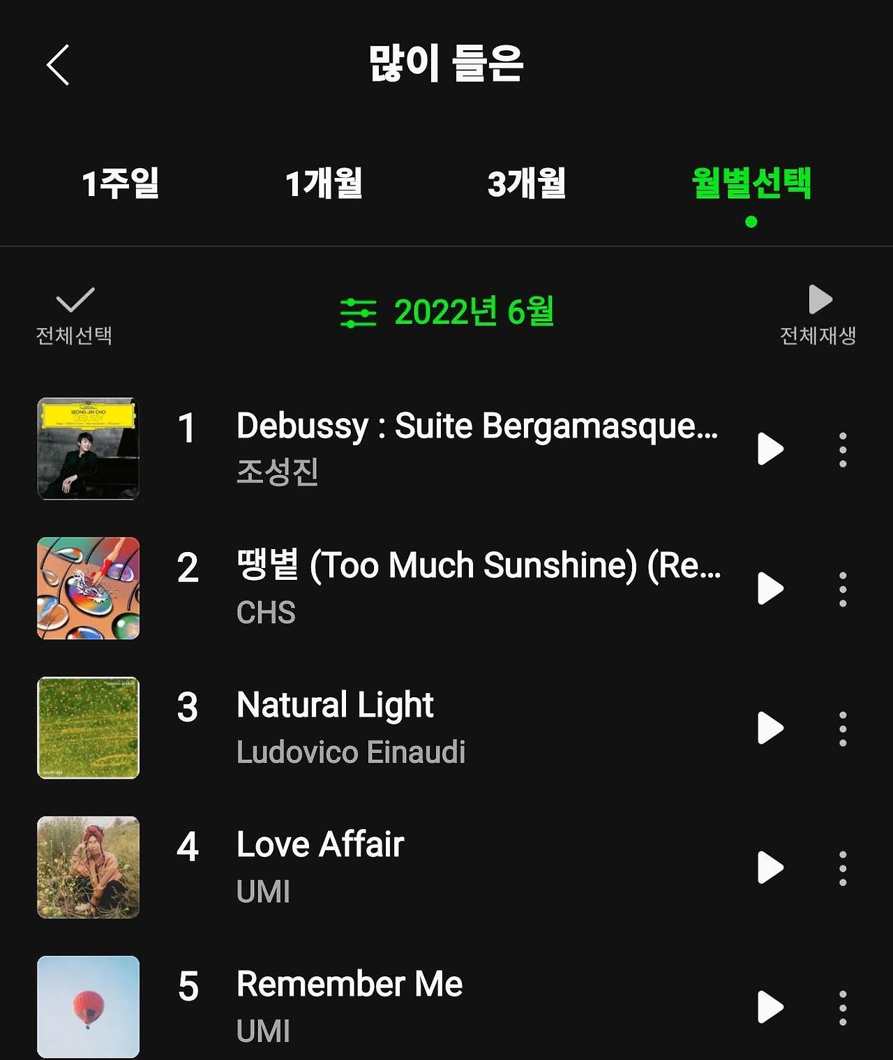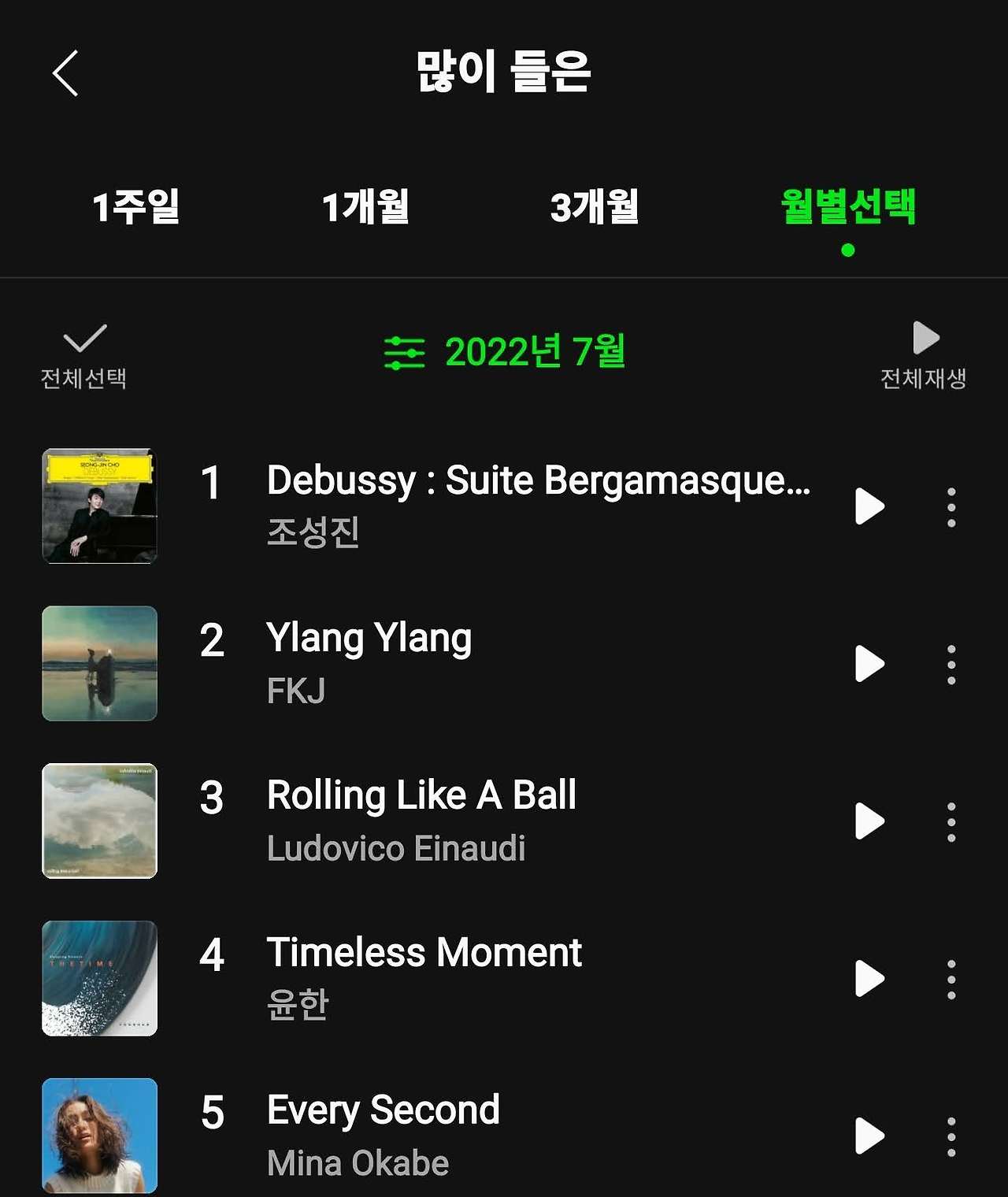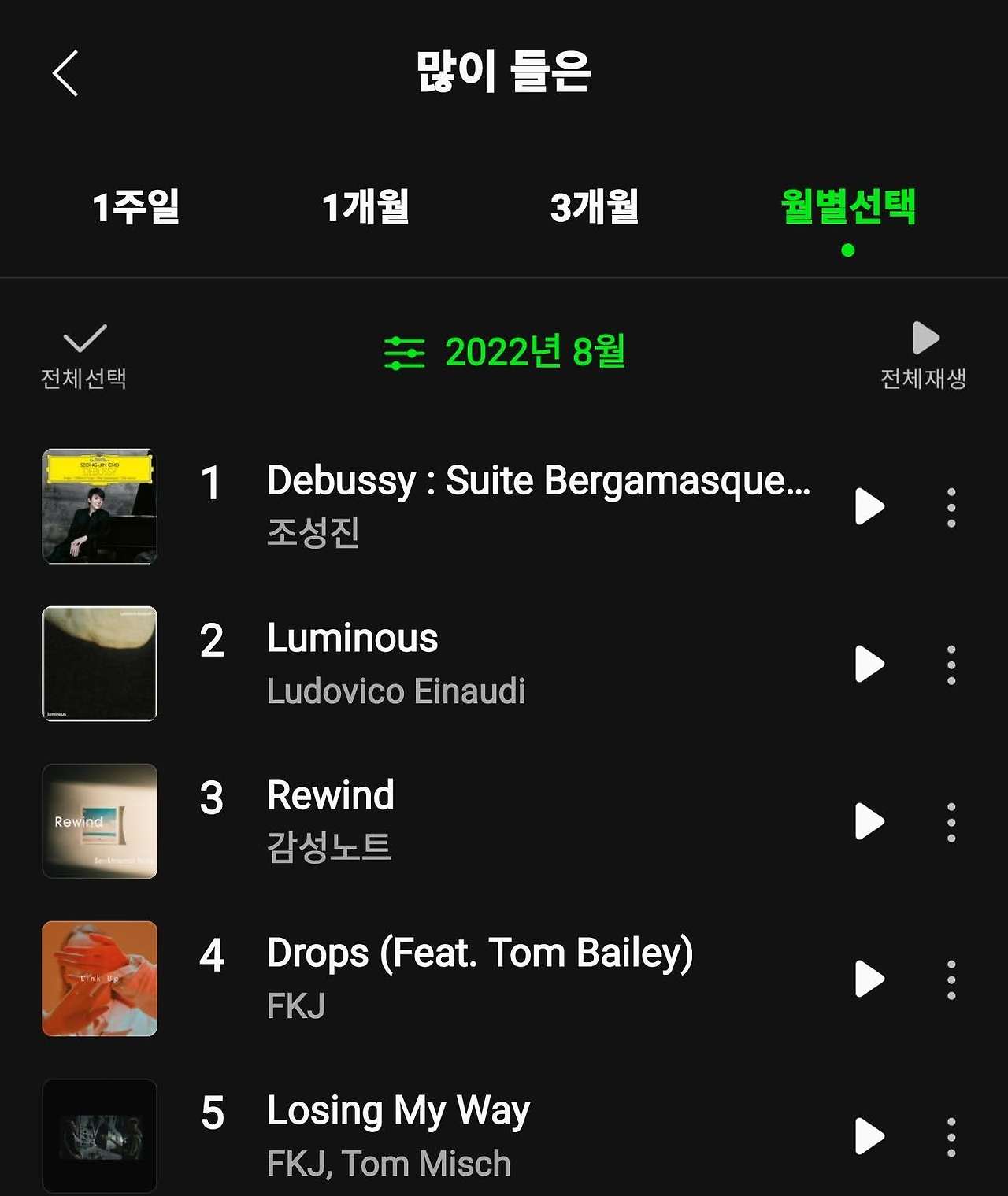 불행인지, 다행인지 드뷔시의 음악으로 감정을 해소하는 행위는 11월로 종료된다. 퇴사를 했기 때문이다. 불안의 한가운데로 나가는 행위라는 걸 알아도 나를 완전히 소진시키는 일을 더 이상 하지 않기로 했다. 회사를 나와도 여러 외부 요인들에 의해 종종 마음에 부상을 입곤 하지만 놀랍게도 지난 수개월간 한 몸과 같았던 '그 곡'만은 찾지 않는다. 퇴사를 한 이후인 11월의 곡 순위가 이를 말해준다.