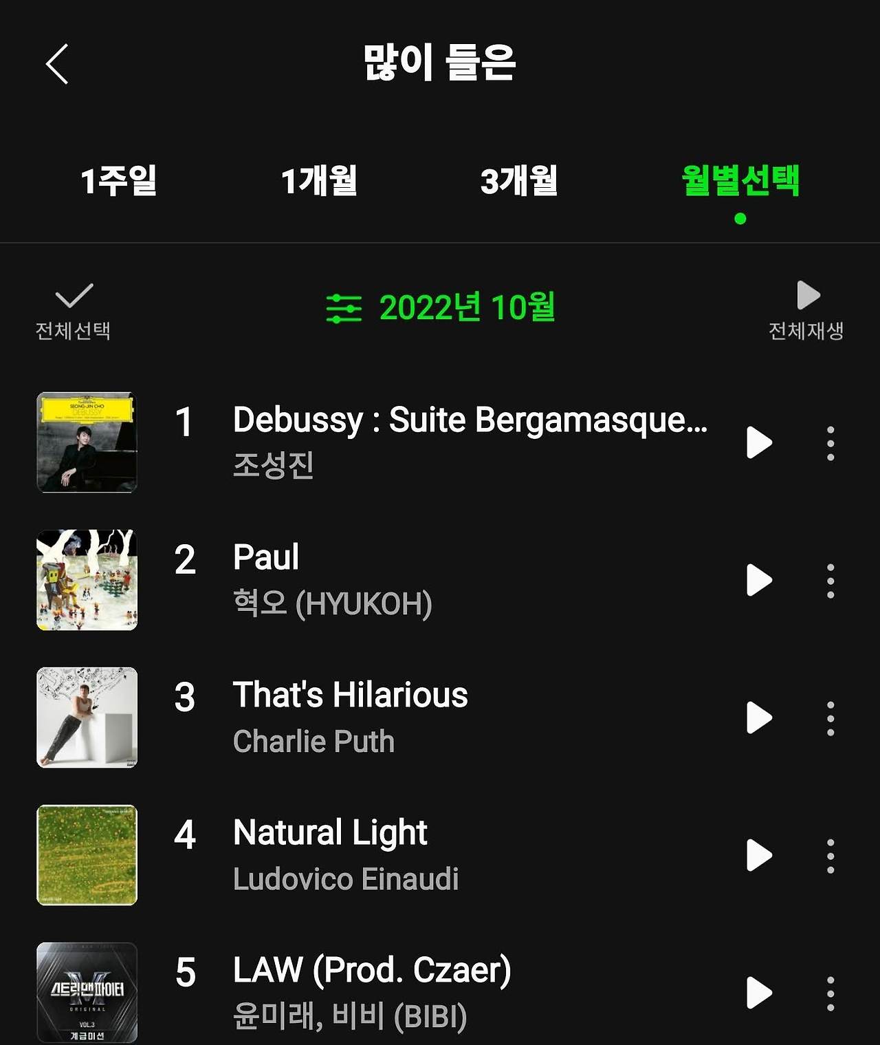 월 별로 가장 많이 들은 곡은 멜론을 다시 구독한 5월부터 10월까지 변함없이 Clair de lune(달빛)이었다. 9월 딱 한 달만 제외하고.