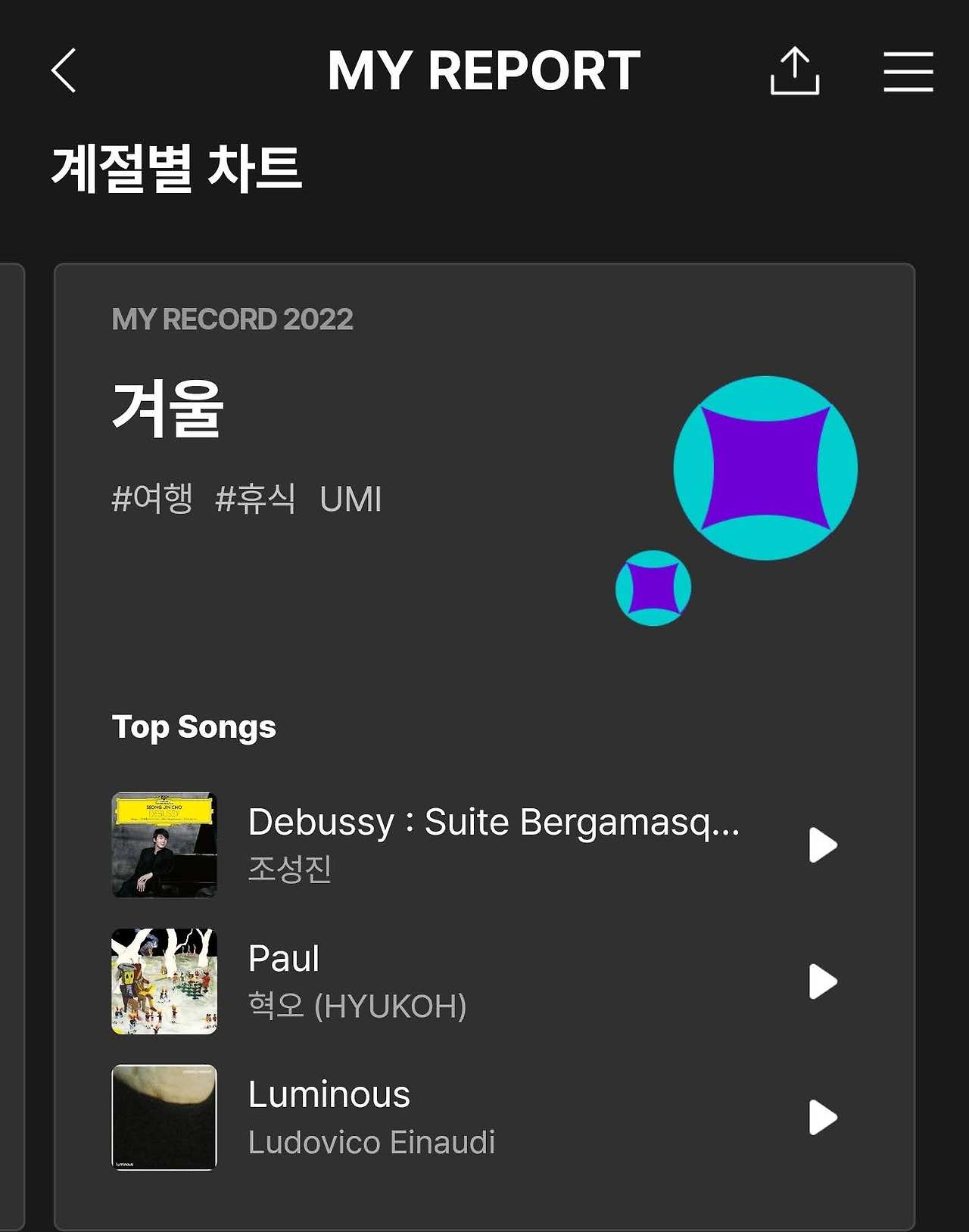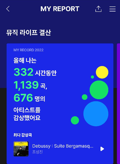 처음엔 음악에 관해 내가 할 말이 있을까 좀 의문스러웠다. 그냥 취향대로 가볍게 들었던 것뿐이라 돌이켜볼 만한 게 과연 있을까 싶었는데 멜론에서 [뮤직 라이프 결산]을 보면서 생각이 달라졌다. (아, 유튜브 플리가 대세인 요즘에 무슨 멜론이냐며 놀라는 사람도 있겠지만 유튜브 프리미엄을 구독하지 않는 나는 추억의 매체로 돌아올 수밖에 없었다...)