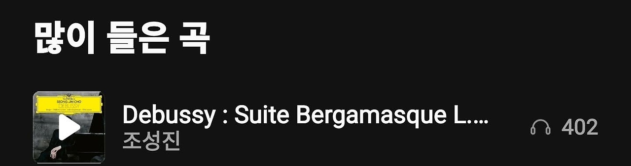 무려 402회의 재생 수를 기록한 곡. 계절별로 확인해 보았을 때도 가장 상위 랭크된 곡은 어김없이 조성진 피아니스트가 연주한 'clair de lune(달빛)'이었다.