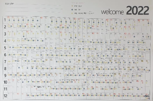 예시 ( 출처 : 쿠팡 )연간 일정을 한눈에 볼 수도 있고 날짜 아래에 여유 공간이 많아 계획한 일의 실행 여부를 체크하기에 적합했다. 고민 없이 구매 후 침대 머리맡에 붙여두고 새로운 기록을 해나가기 시작했다.