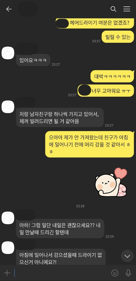 결정적인 건 헤어드라이기를 같이 쓰게 친구 방 욕실이 아닌 거실에 꺼내놓아줄 수 있냐고 묻자 안 가져왔냐며, 코드 꼽았다 뺐다 하기 번거롭다며 곤란해할 때였다. 난 이미 자기 일상으로 지치고 힘든 친구에게 짐이 되고 있다는 생각에 주눅이 들고 눈치를 보는 상황이어서 얼른 지인에게 빌려보겠다고 말했고 차를 빌려주기로 한 제주 사는 오랜 지인에게 혹시 헤어드라이기 여분이 있는지를 물었다. 있다고 빌려주겠다고 바로 답이 왔고, 더 감동이었던 건 밤 11시가 넘은 시간에 다음날 아침에 필요한 거 아니냐고 물어본 것. 필요하다고 하면 그 시간에 당장 갖다줄 기세였다. (다음 날 차를 빌려줄 때도 오랫동안 주차장에 세워둔 차라 남자친구가 일부러 타이어도 갈고 배터리를 충전시키기 위해 한참 몰고 다니다 갖다주며 나를 또 감동시켰다.) 그렇게 나는 환대의 기본은 사람의 마음을 편하게 해주는 거구나 생각하며 심란한 마음으로 잠자리에 들었다.