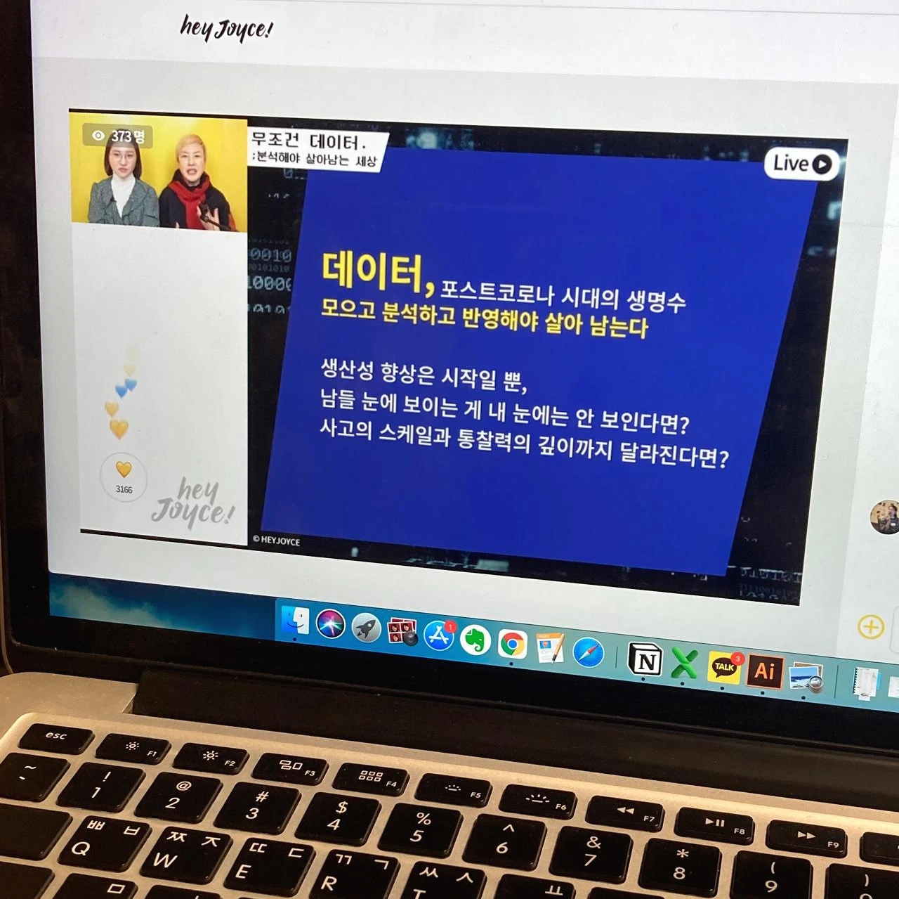헤이조이스는 계속 관심 갖고 지켜보던 커뮤니티였는데 이번 기회를 통해 헤이조이스에 가입하게 되었다. 첫째 날 약 500명, 둘째 날 약 400명의 여성들과 함께 강연을 들었는데, 그중 지인이 다섯 명이나 있더라. (세 명은 내가 영업했다.) 채팅 기능을 통해서 읽어보면 좋을 책이나 참고하기 좋은 홈페이지 등 멤버들 사이에서도 유익한 정보가 오고 갔다. 연사자분이나 진행자분도 채팅을 즉각적으로 참고하며 행사가 진행되어, 오프라인의 한계를 넘어선 것 같은 느낌이 들었다. 채팅에서 참여자분들이 이야기한 것들 중 가장 기억에 남는 문장은 "엑셀을 어렵다고 하는 것은 마치 폴더폰을 쓰는 사람이 스마트폰을 어렵다고 하는 것과 같다."는 문장. 그게 무엇이 되었든 우리는 항상 새로운 시대에 적응하고 새로운 것을 잘 이용해왔듯이, 이번에도 너무 낯설어하거나 두려워할 필요는 없겠다는 자신감으로 충만해진 이틀이었다. 그리고 이러한 자신감은 인생 선배, 인생 동료라는 데이터들을 통해 도출할 수 있는 인사이트가 아닐까.