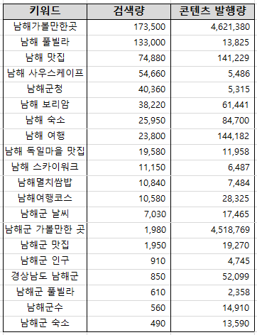 빅데이터 기반 키워드 분석 홈페이지 ‘블랙키위’를 통하여 ‘남해군’과 ‘고성군’을 검색한 결과, 2021년 5월 20일부터 6월 18일까지의 ‘남해군’ 월간 검색량은 11,010건, 월간 블로그 콘텐츠 발행량은 2,930건으로 나타났다.