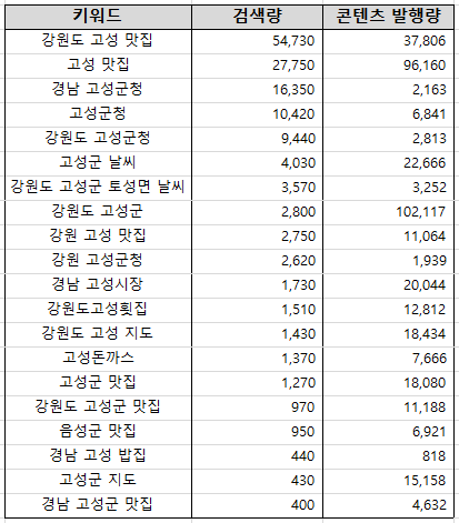 ‘남해군’의 연관 키워드로는 ‘남해 가볼 만한 곳’, ‘남해 풀빌라’, ‘남해 맛집’ 등 관광 관련 키워드가 검색량의 상위를 차지하는 것으로 나타났다. 반면 ‘고성군’의 월간 검색량은 7,550건, 월간 블로그 콘텐츠 발행량은 4,040건이었다. 해당 결과는 경상남도 고성군과 강원도 고성군에 대한 검색 결과 데이터가 합쳐진 것이었는데, 그에 비해서는 남해군보다 검색량과 콘텐츠 발행량이 비교적 낮은 것으로 나타났다. 연관 키워드 또한 강원도 고성과 그 결과가 혼재되어 있었으며, ‘강원도 고성 맛집’이 검색량의 상위를 차지하였다.